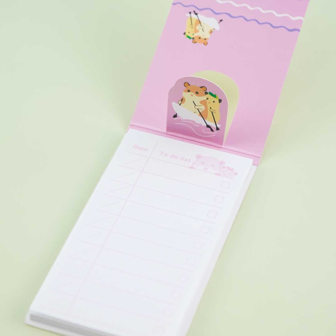 Make sure you stay on top of your schedule with this kawaii to-do list memo stand! It showcases a print of hamster brothers riding a canoe. It has a mount so that you can keep it upright!