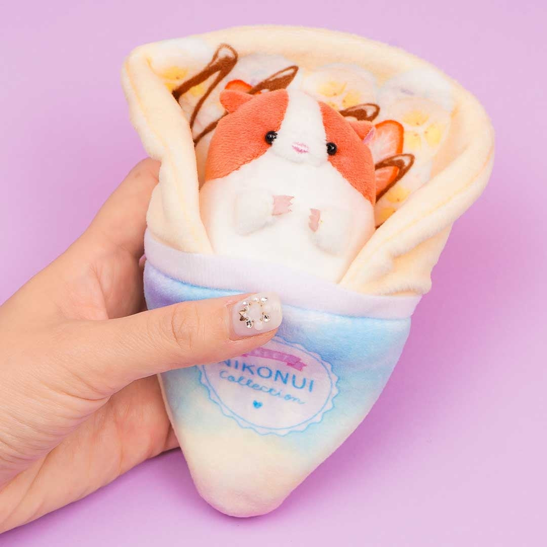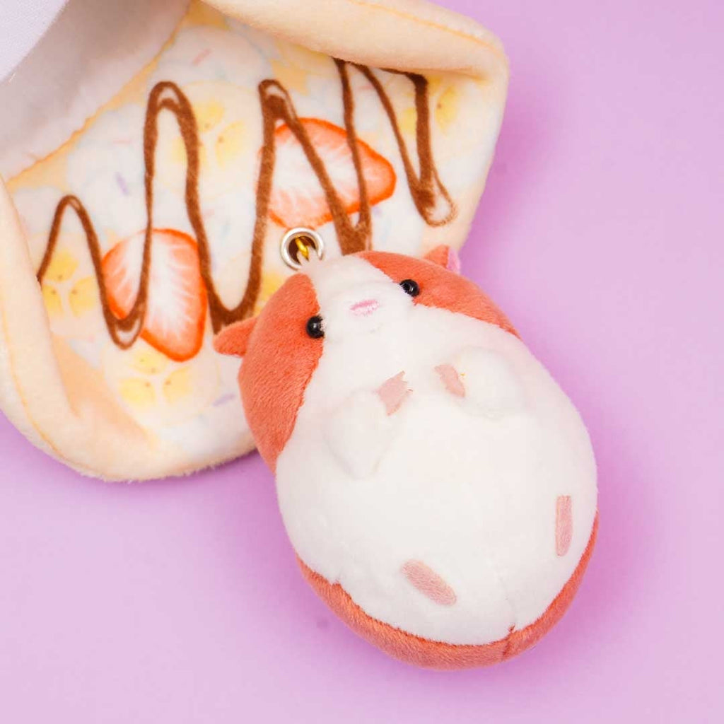 • A cute mini-sized hamster plushie charm relaxing a in a removable crepe
