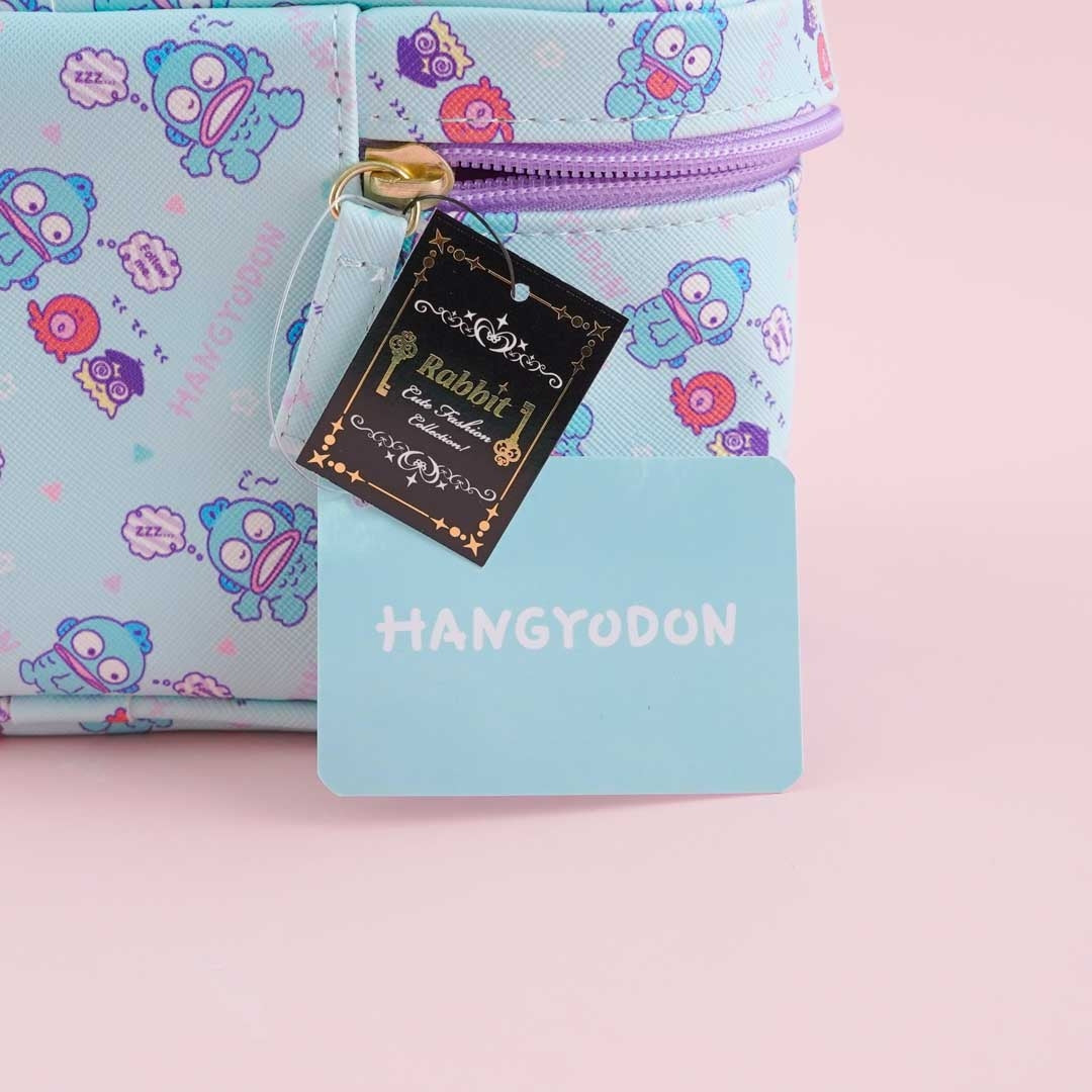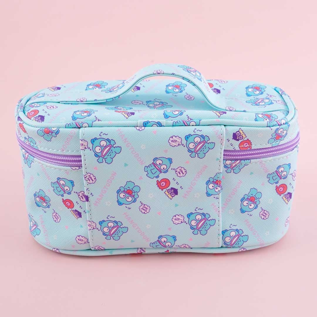 A cute vanity bag with a handle and features Hangyodon and his pals