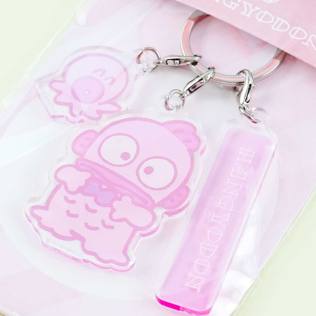 Keep your keys organized with this cute keychain. It has three pink acrylic charms featuring Hangyodon and his friend Sayuri! Each charm has its own metal clip. You can attach your keys to the keyring.