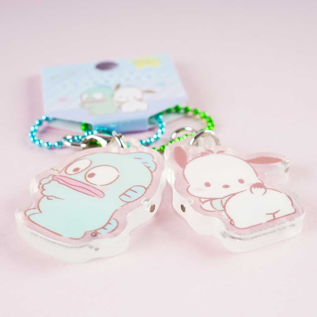 • A cute pair of acrylic charms showcasing Pochacco and Hangyodon