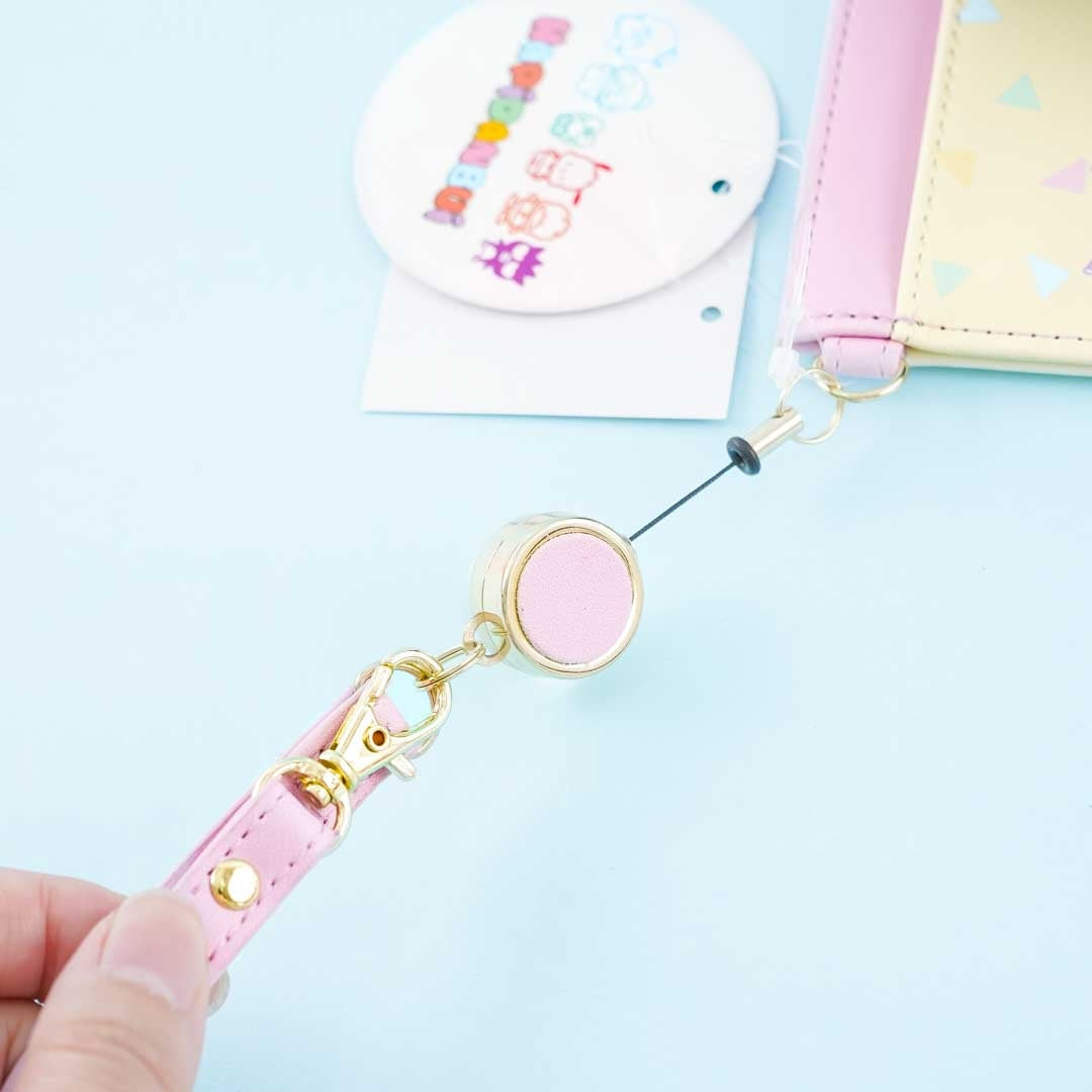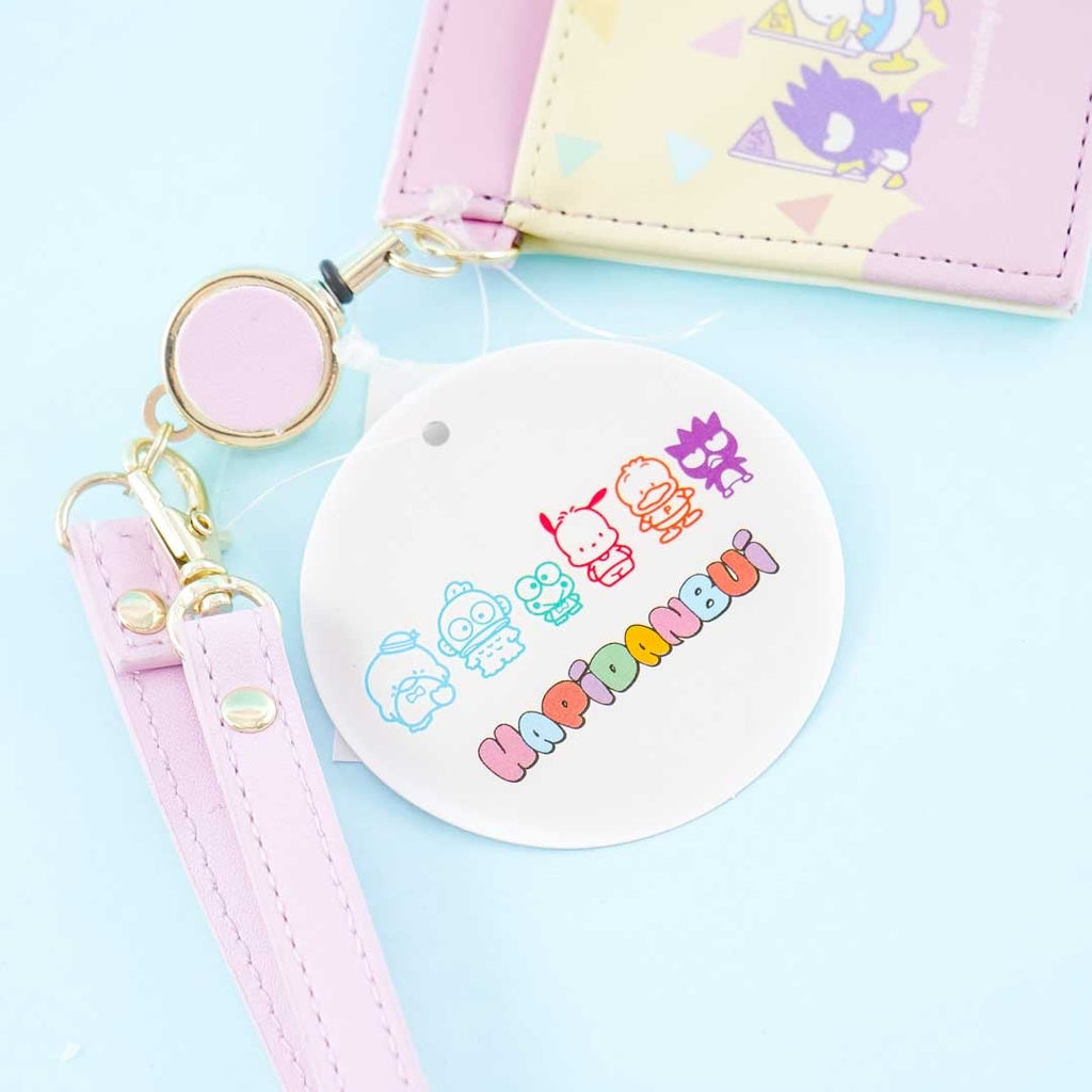 This super kawaii card case features a print of the Hapidanbui characters walking around carrying banners like in a parade! Use this synthetic leather case to bring along your bass pass or ID. It has a retractable reel and a strap with a metal hook!