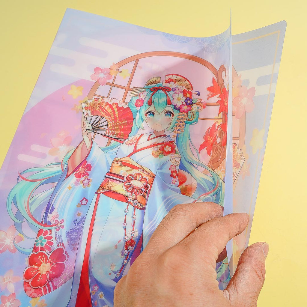 This cute clear plastic folder is illustrated with Hatsune Miku from Project SEKAI dressed as a Maiko. It comes from the Hatsune Miku Kyoto series! Use it to organize your papers for work or for school.