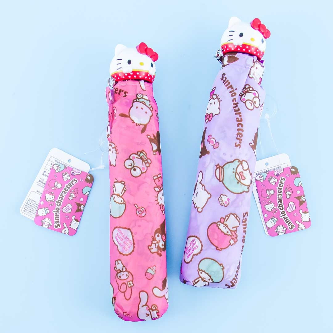 Stay dry during the rainy season with this super kawaii pastel foldable umbrella featuring prints of different Sanrio characters! It has a cute handle shaped like Hello Kitty's head. You can fold the umbrella, close it with its velcro closure, and keep it in its carrying case when you don't need it.