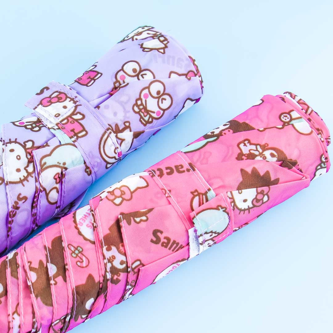 A kawaii pastel foldable umbrella covered in prints of different Sanrio characters