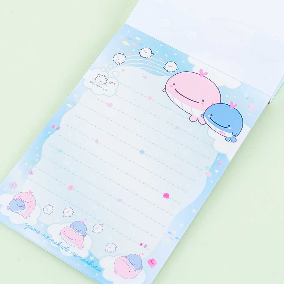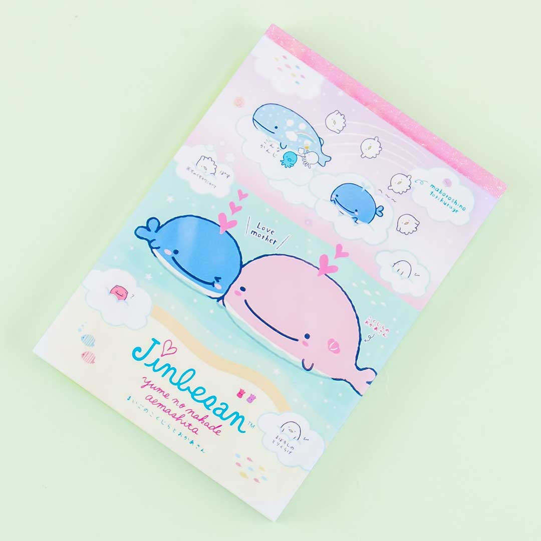 Scribble down your notes using this kawaii notepad featuring Jinbesan swimming with his family! Its pages have four different designs. The notepad also has a sticker sheet on the front page.