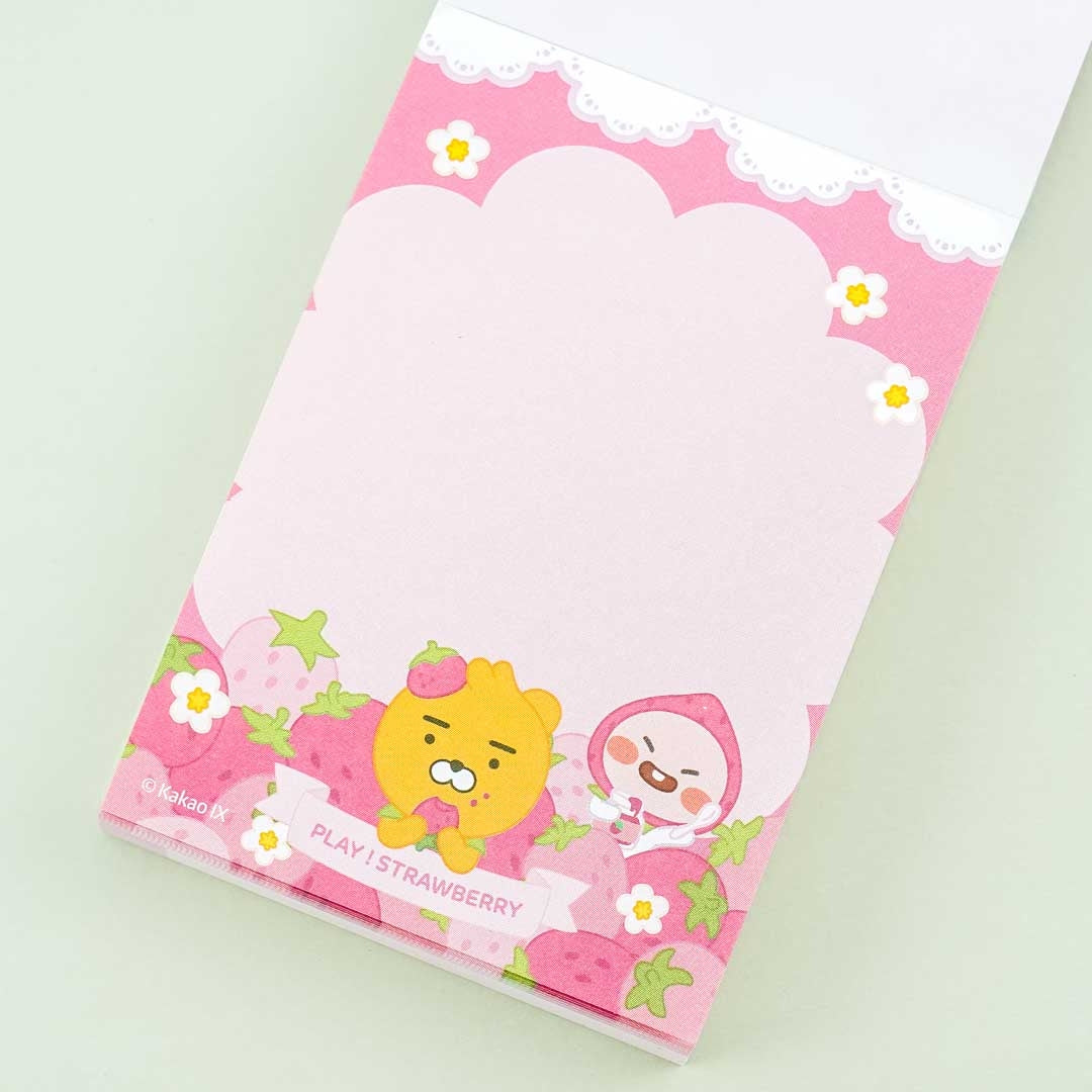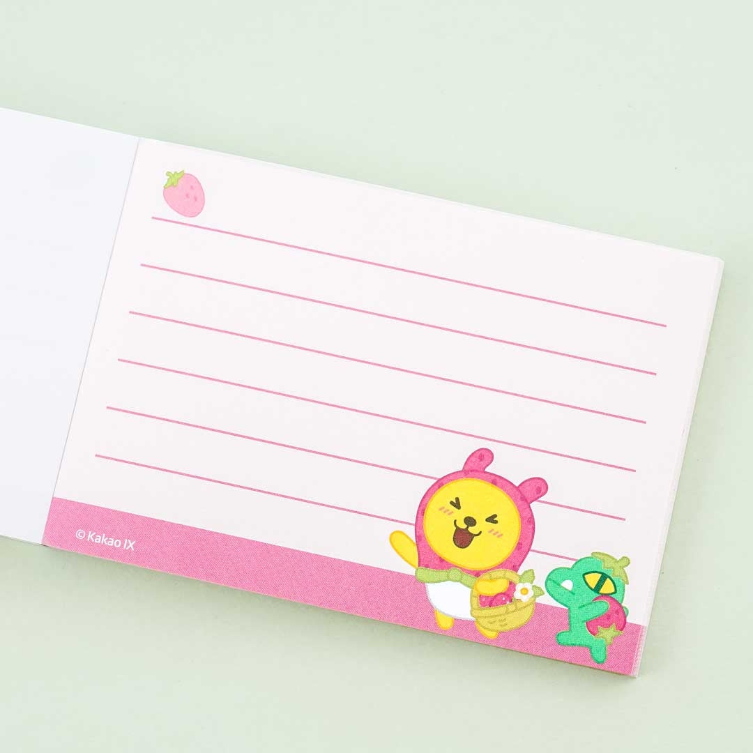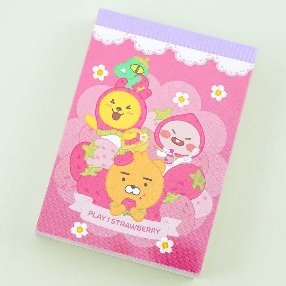 A small memo pad with kawaii illustrations of Kakao Friends characters in strawberry costumes