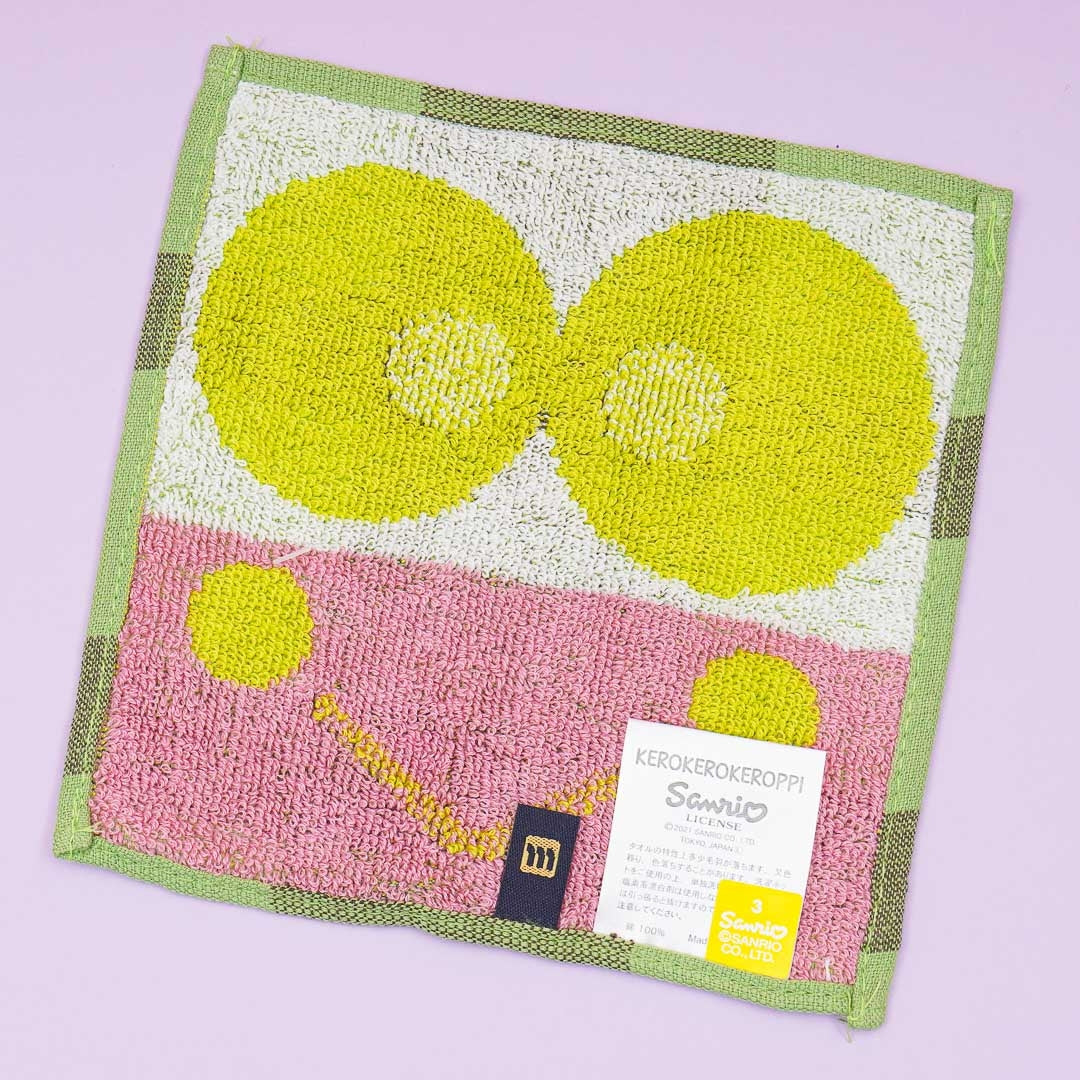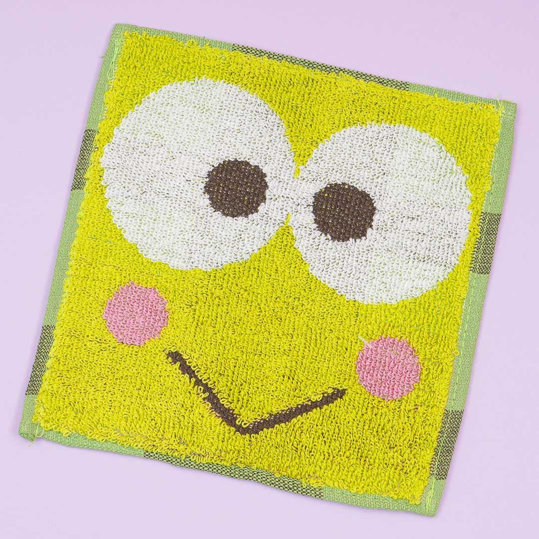 • A super kawaii hand towel showcasing a print of Keroppi's face