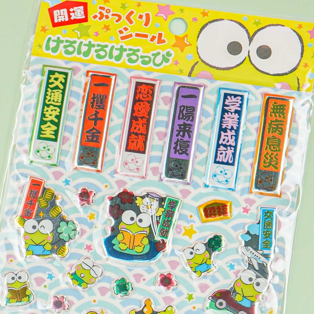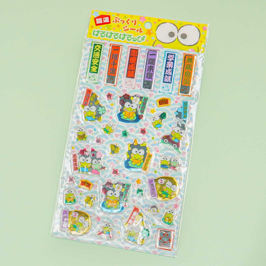 • A kawaii sheet of puffy stickers illustrated with a happy Keroppi and Japanese idioms