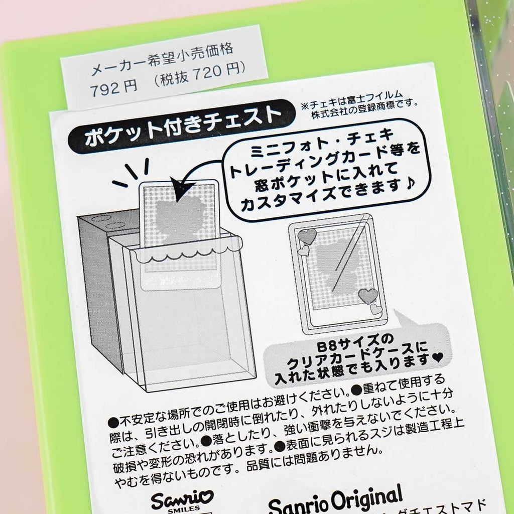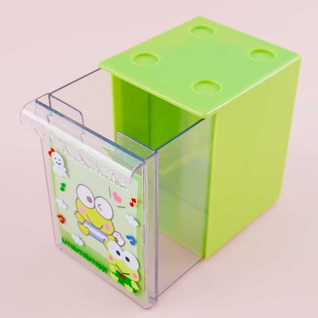 Use this cute drawer chest to store your pens, charms, and other knick-knacks. It showcases Kero Kero Keroppi! This chest has a window pocket so you can place your own photo or trading card.