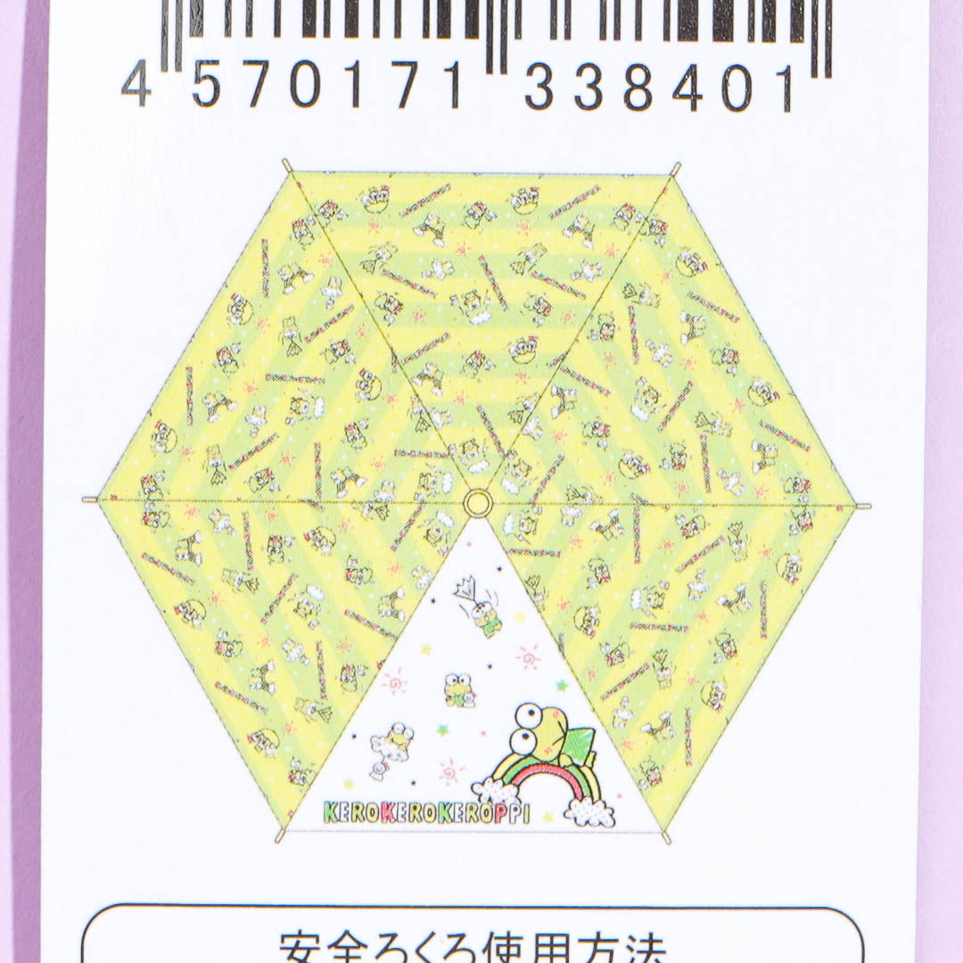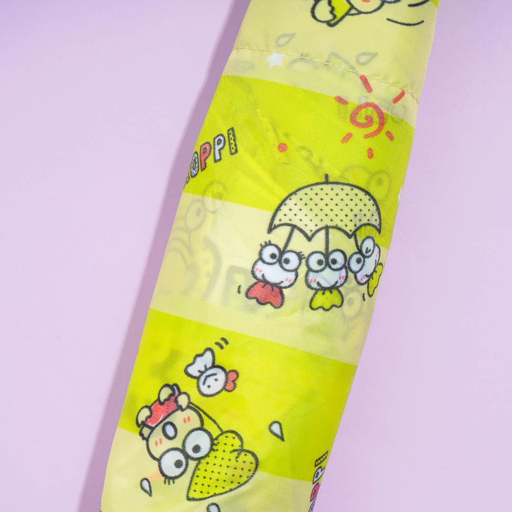Protect yourself from the sun or rain while outdoors using this super cute folding umbrella! It has kawaii prints of Keroppi playing in the rain with his besties! The umbrella also has a convenient curved handle.