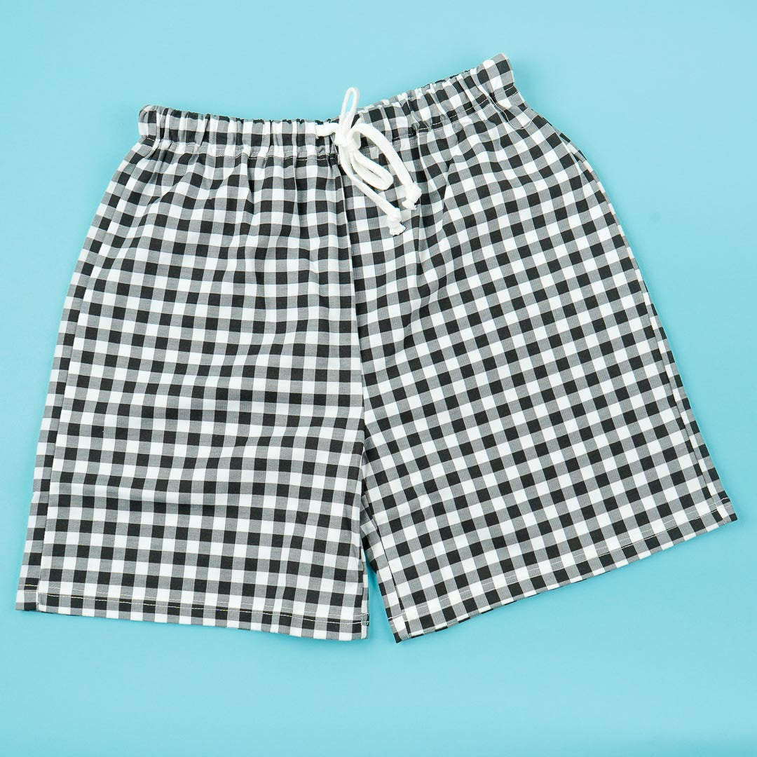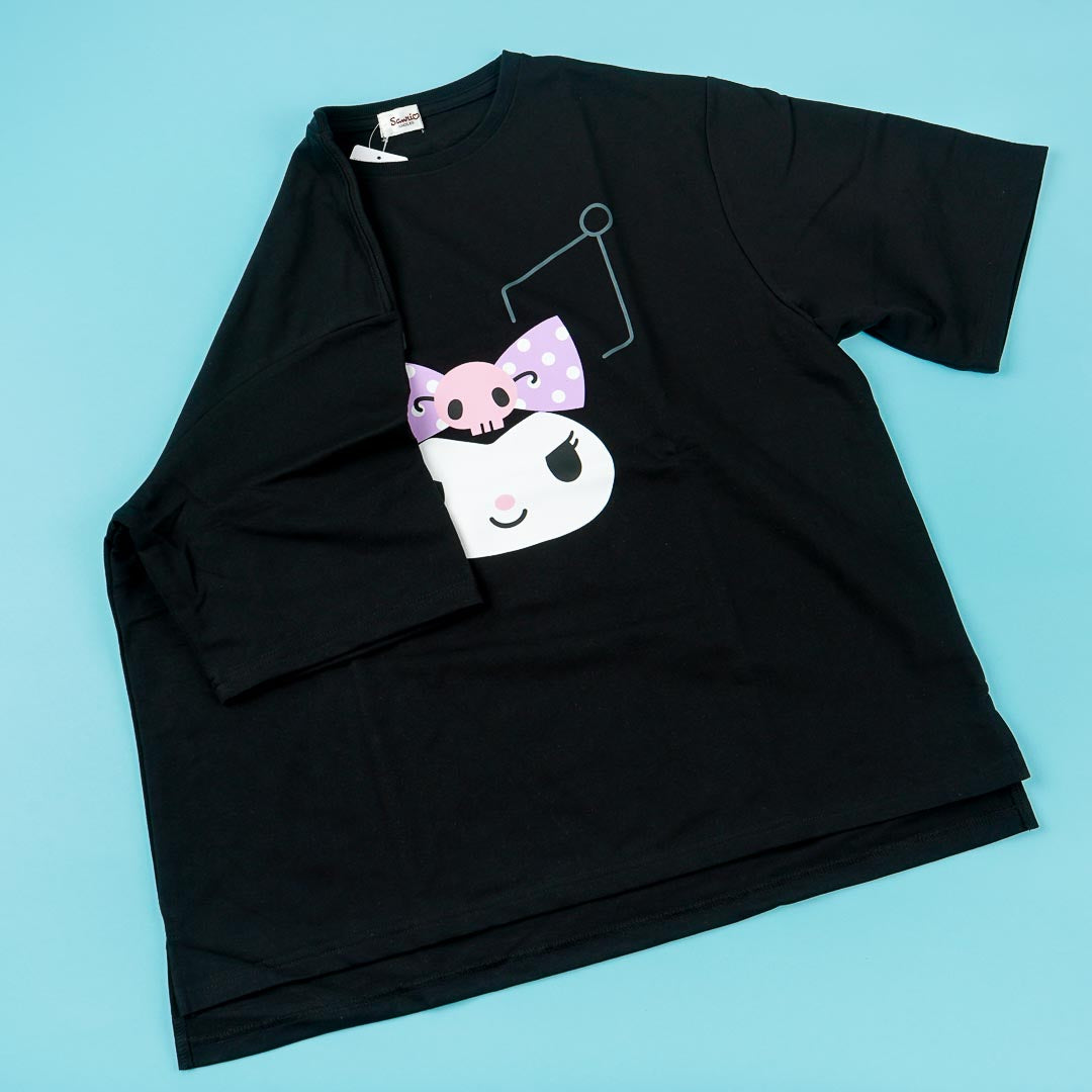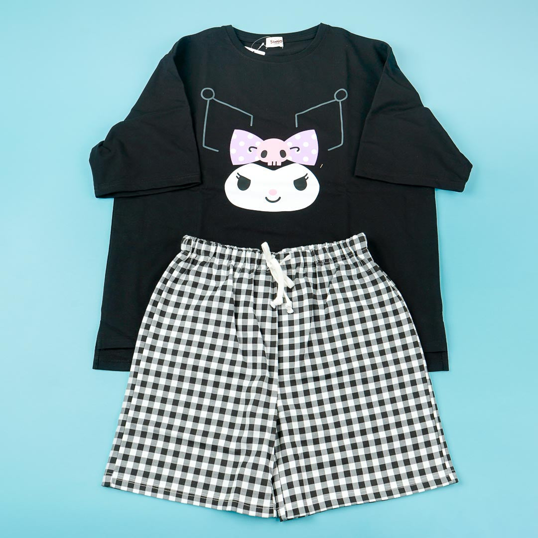 Be the cutest one at your next slumber party with this kawaii Kuromi pajama set. The set comes with a shirt that features Kuromi's face and elastic checkered shorts. You can use it for bed or just around the house.