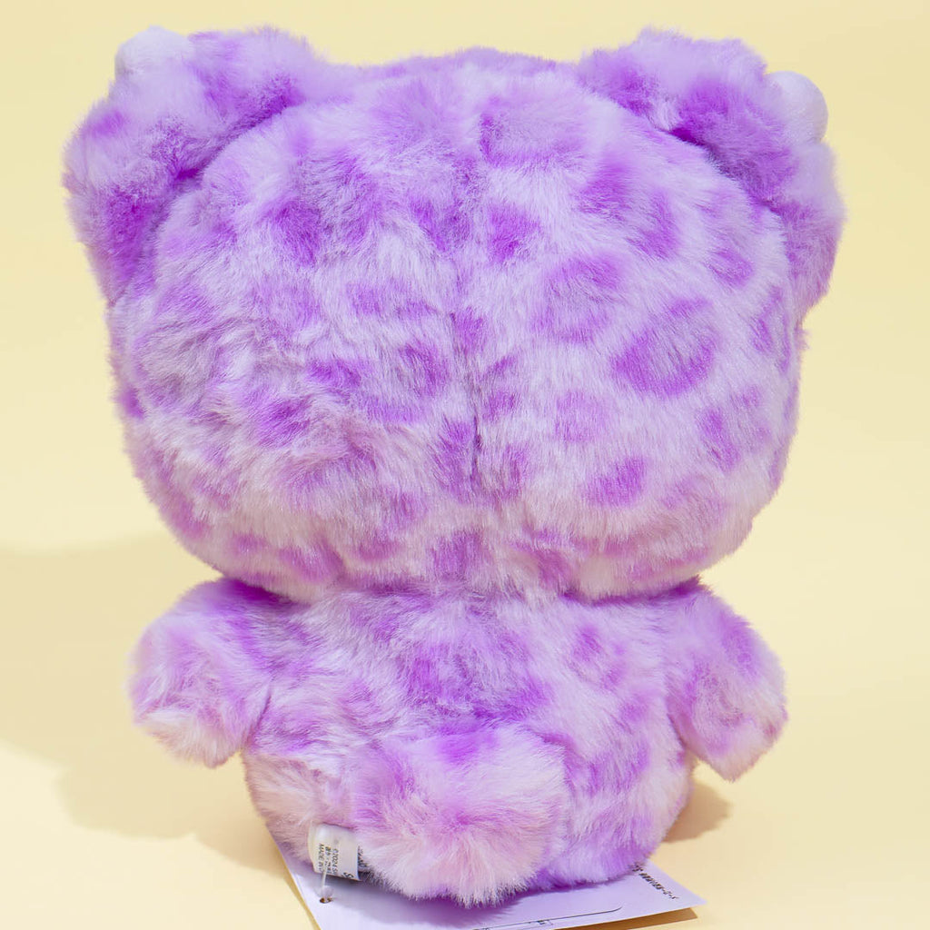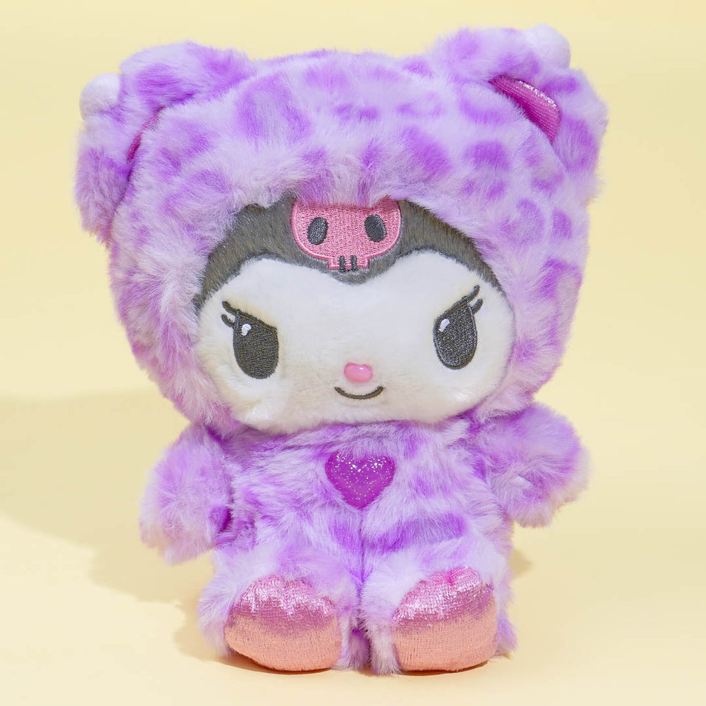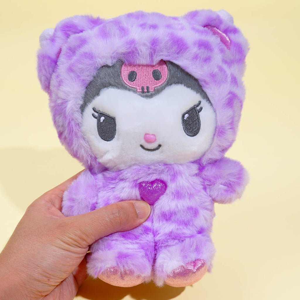 This kawaii Kuromi plushie is dressed up as a snow leopard! It comes from Sanrio's Gyaru Kuma series. Have fun playing together with this medium-sized cutie, though you can't remove the heart part on its chest or its hood.