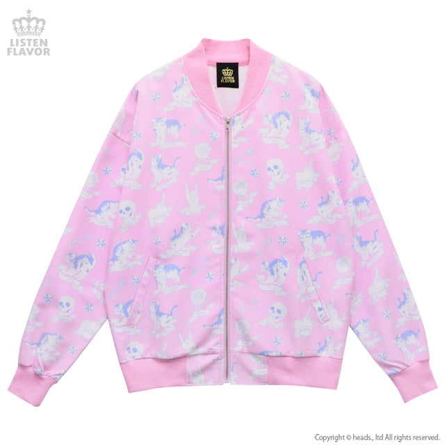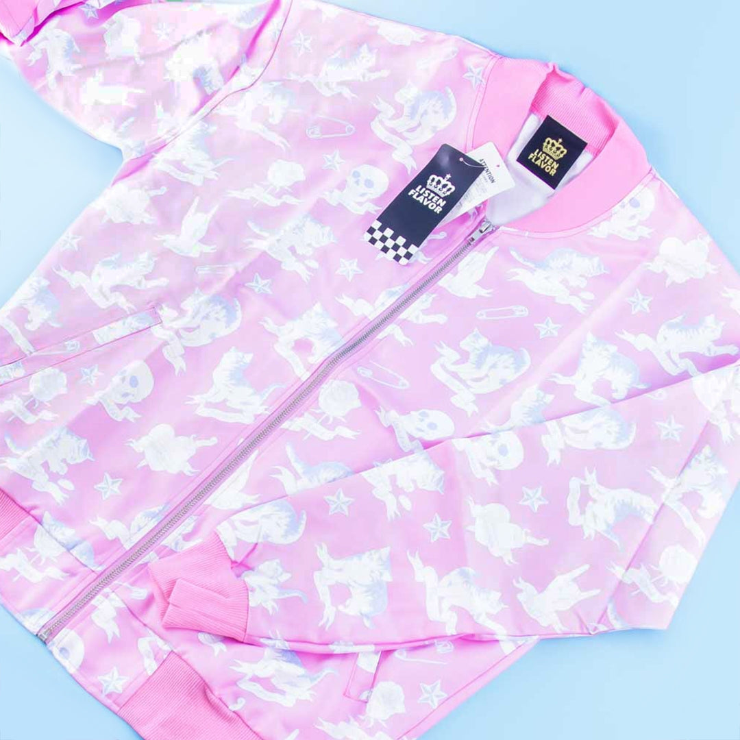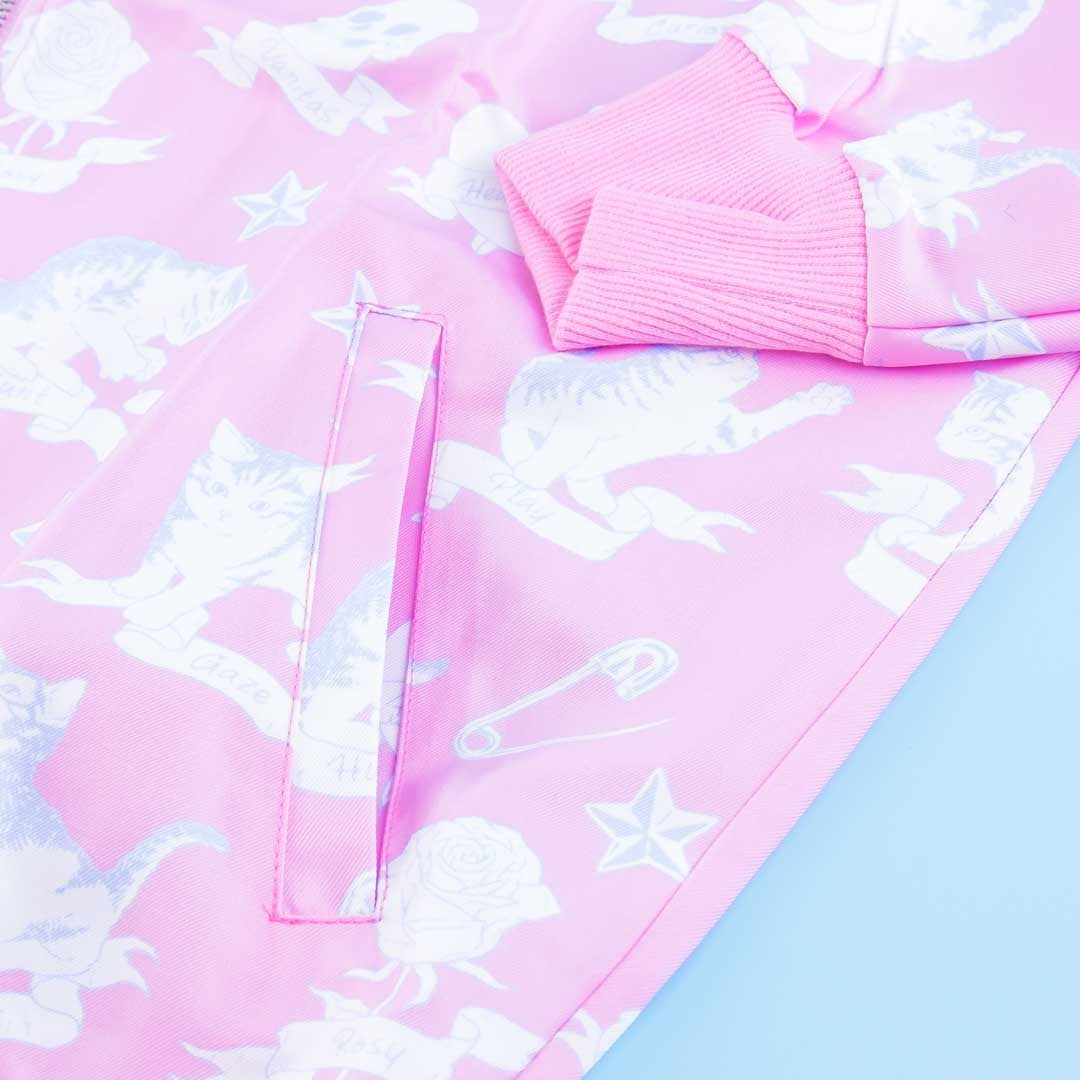 A super kawaii Harajuku-style pastel pink windbreaker jacket featuring pale skulls, roses, and cats