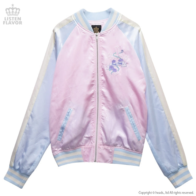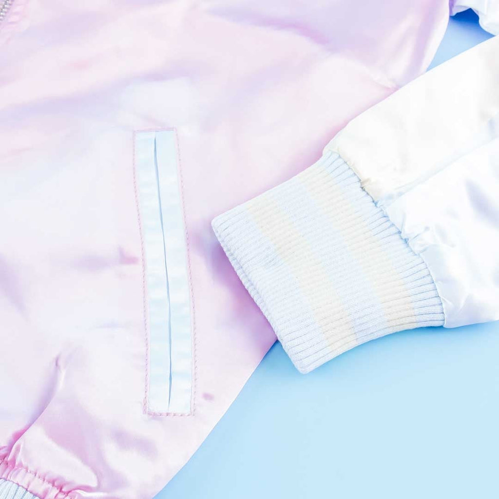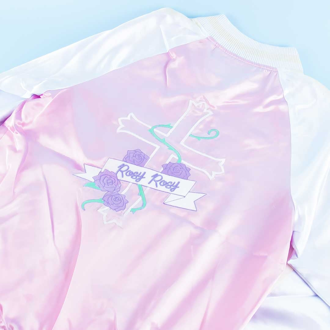Add this super kawaii Harajuku-style bomber jacket to your wardrobe! This fashionable pastel pink jacket features a print of violet roses growing over a gothic cross. Wear this polyseter jacket to add a dose of kawaii to your outfit ensemble!