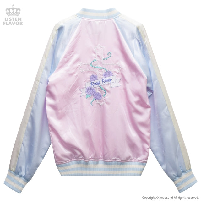 A cute Harajuku-style bomber jacket with a print of roses growing over a gothic cross