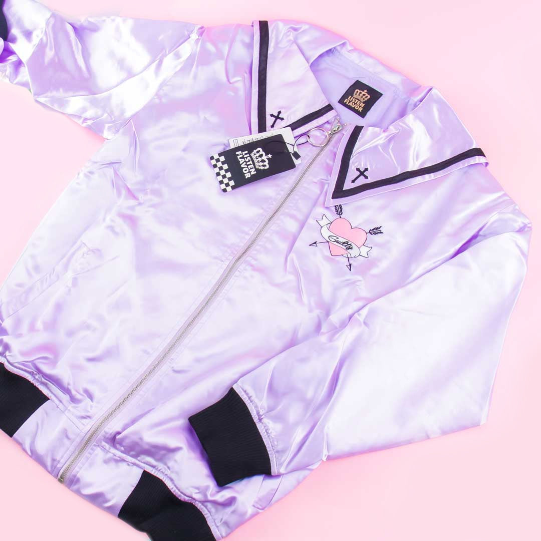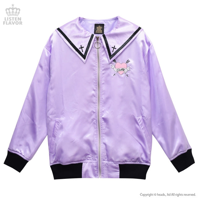 A cute Harajuku-style windbreaker jacket with a sailor collar and a print of heart with arrows sticking out of it