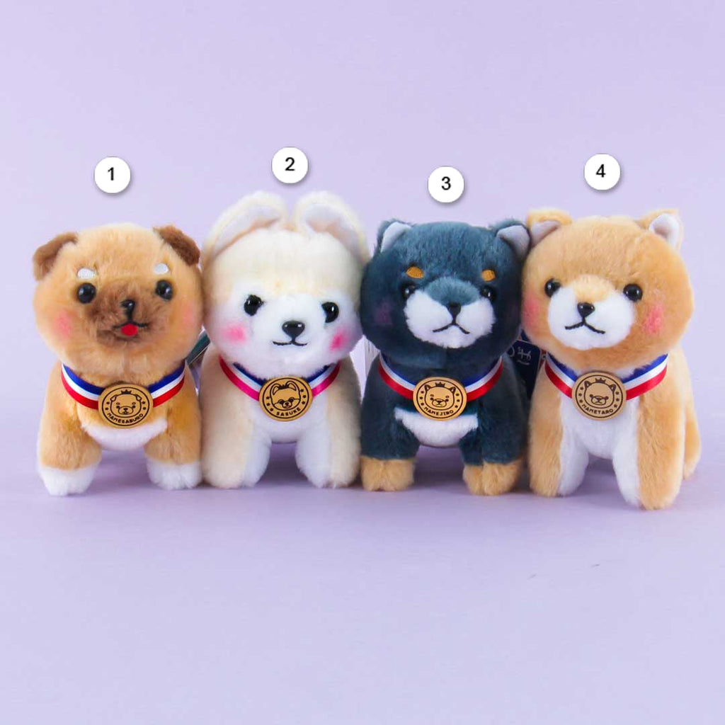 A small size Mameshiba San Kyodai plushie wearing a gold medal