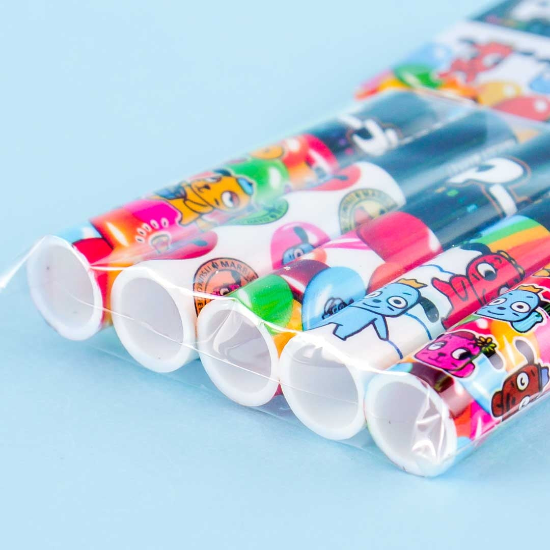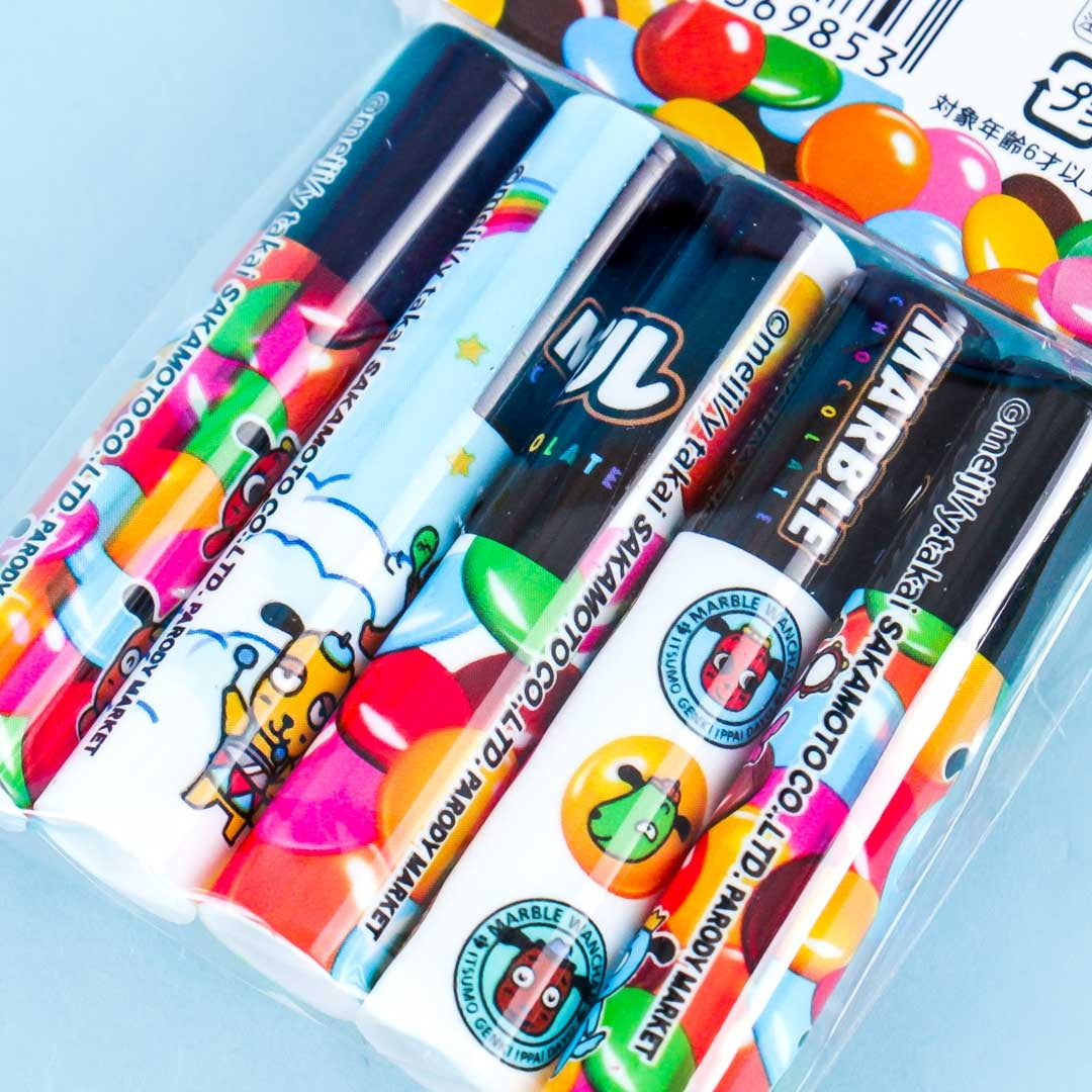 This set of pencil caps has illustrations of Meiji Marble Chocolate candies and its super cute dog mascots! Place these caps on your pencils to protect their newly-sharpened lead tips.