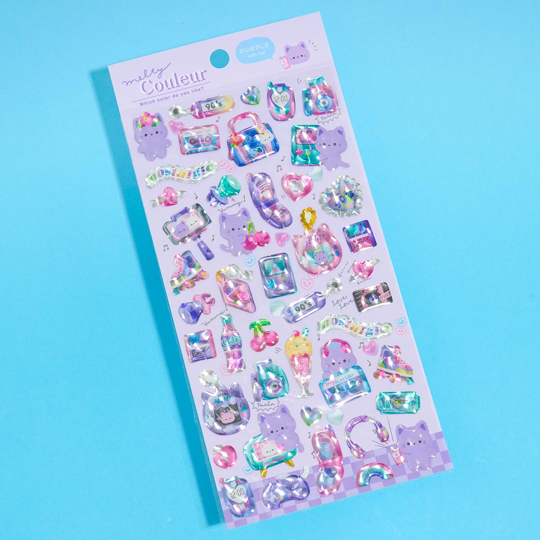 Bedazzle your laptop by decorating it using these cute and shiny puffy stickers! The design features a purple cat and other kawaii stuff with a holographic finish.