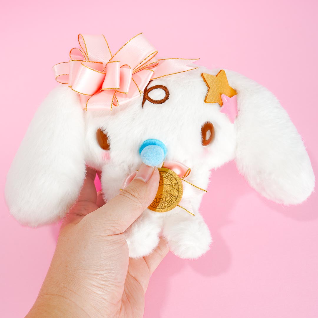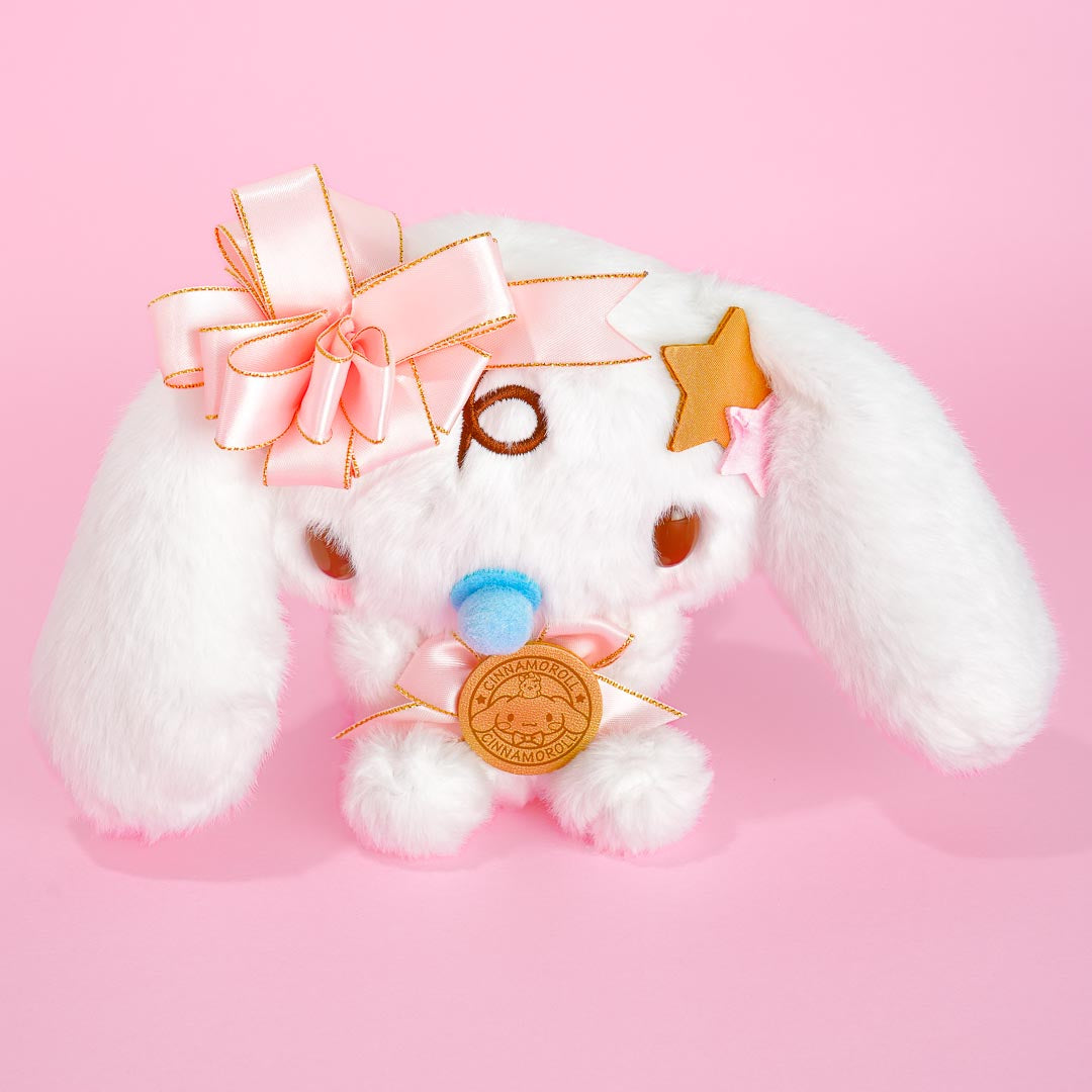This cute Milk plushie is wearing ribbons to celebrate Cinnamoroll's birthday! Have cute tea parties and picnics together with this medium-sized stuffed toy. It's the perfect addition to your kawaii plushie collection.