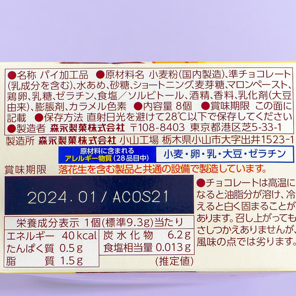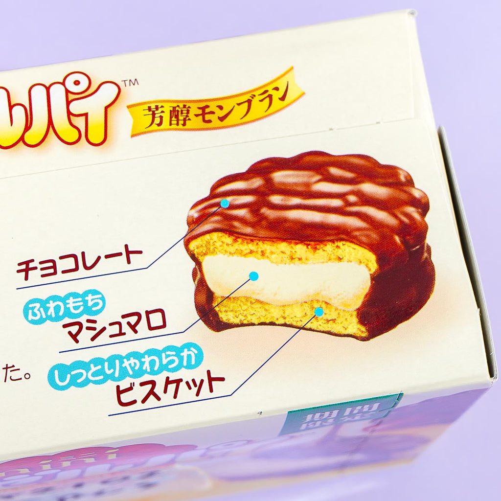 Indulge in this limited-edition box of bite-sized angel pie snacks. Each chocolate-covered pie treat is filled with mellow chestnut cream. It's the perfect falltime treat!