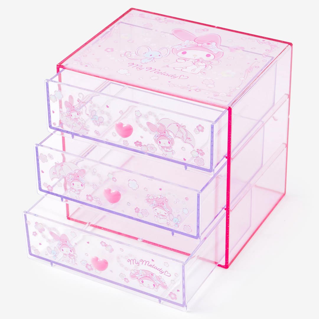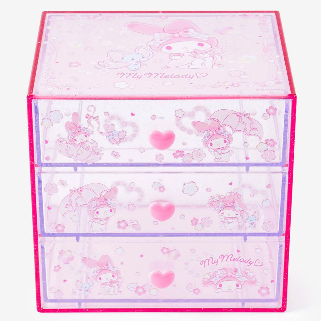 This mini drawer chest features illustrations of My Melody with a kawaii sakura design. It has three transparent, glittery drawers and heart-shaped knobs. The compact size is perfect for organizing small items while adding a dose of cuteness to your desk!