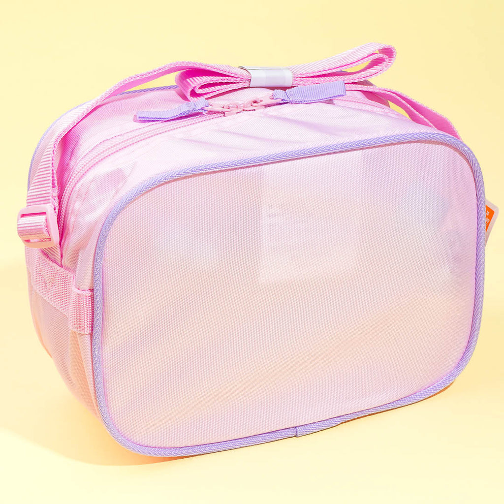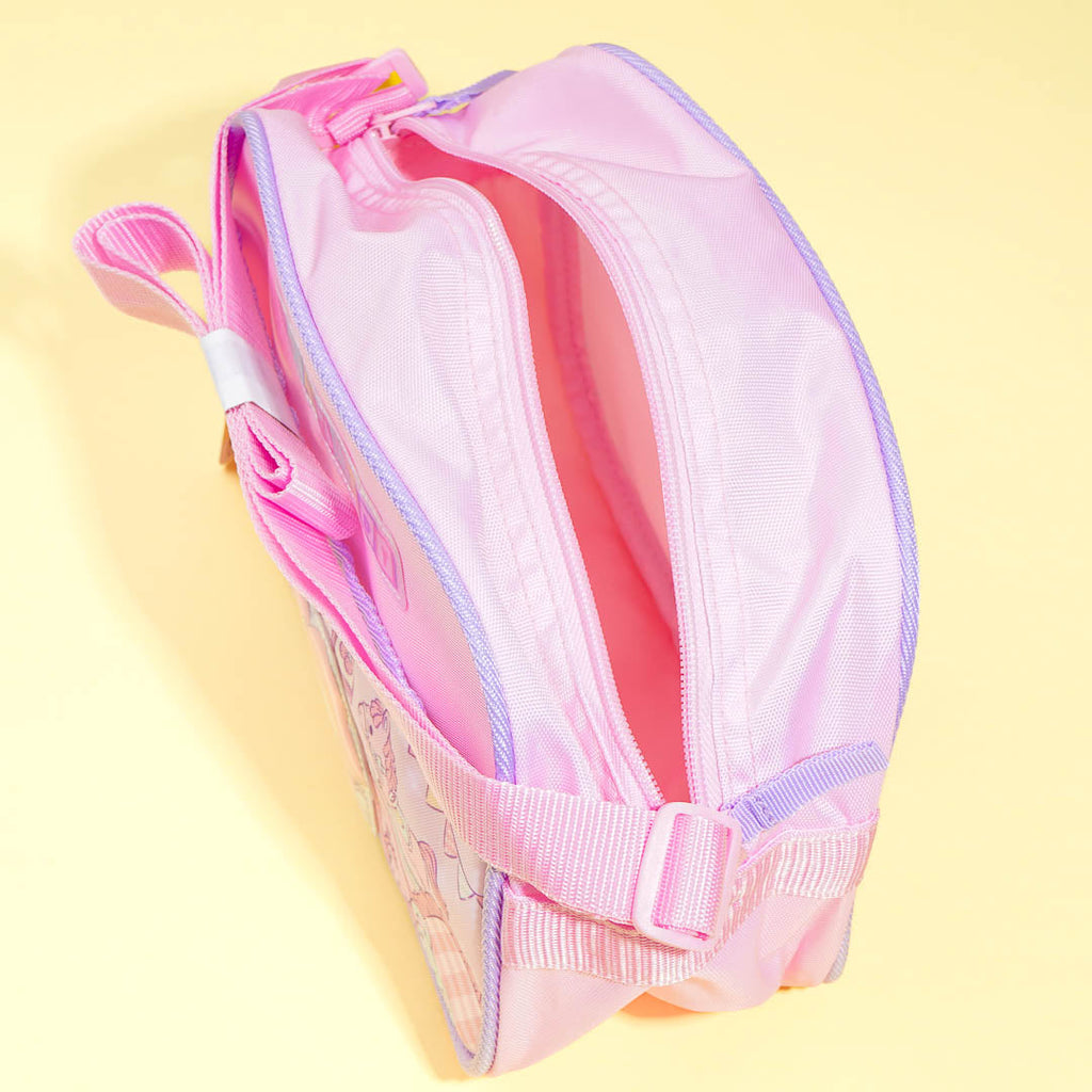 This super cute shoulder bag featuring a toddler My Melody and her bedroom is perfect for your school stuff! It has a small outer pocket, an adjustable shoulder strap, and a double-zipper closure. There's even a name tag inside!