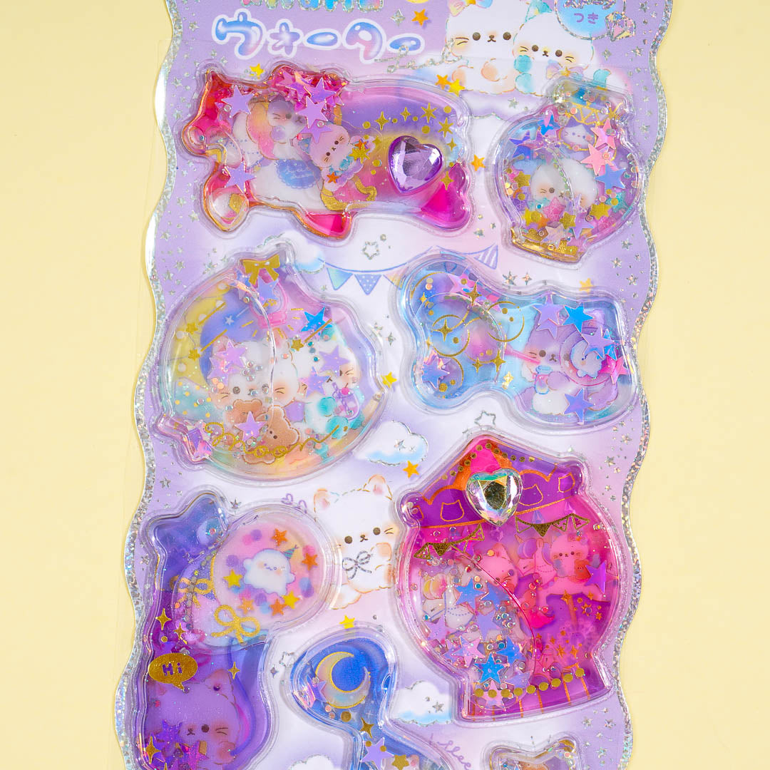 Have fun decorating your gadgets with this sheet of super kawaii puffy stickers! It has colored water inside and features illustrations of cute and fluffy kittens at night. Some of the die-cut stickers even have jewel decors!