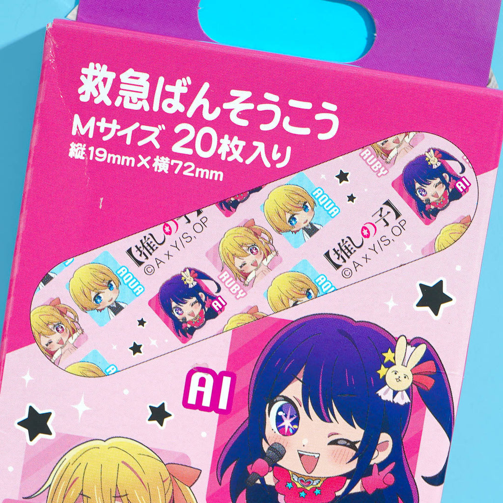 Cover up small cuts and scrapes with these cute Oshi no Ko bandages! This cute boxed set features 20 bandages with six different chibi-style designs of Ai, Ruby, and Aqua.
