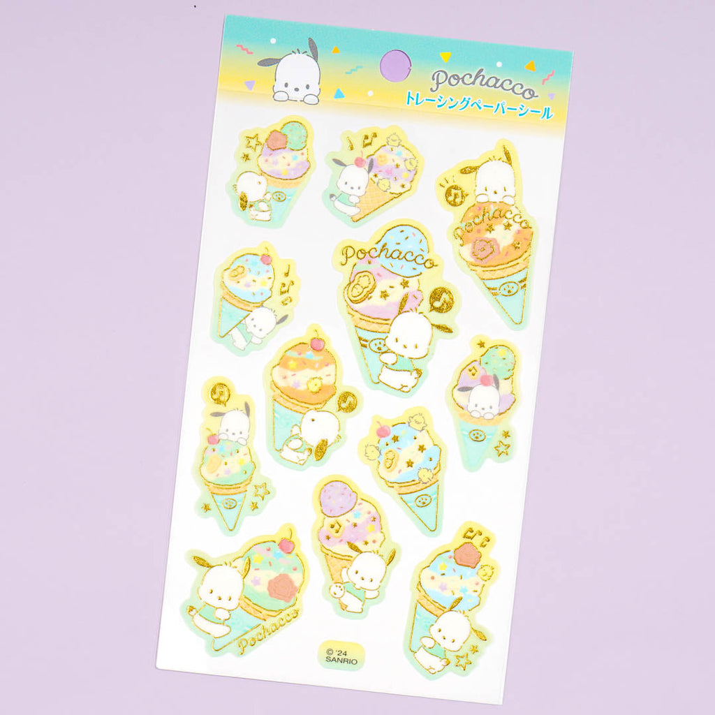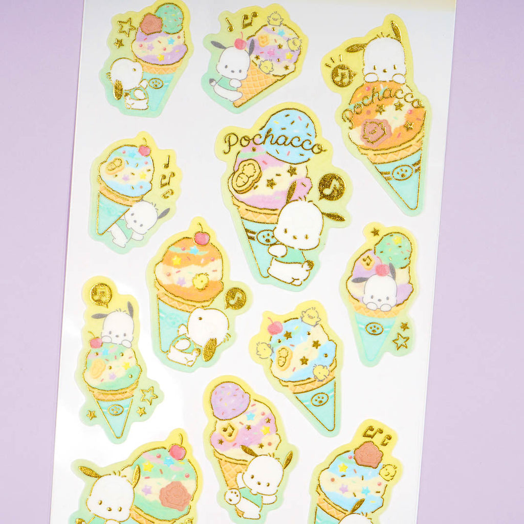 Have fun decorating your notebooks with these super cute stickers! They showcase a die-cut print of Pochacco holding onto a giant ice cream cone. The stickers even have gold foil stamping for added kawaii!