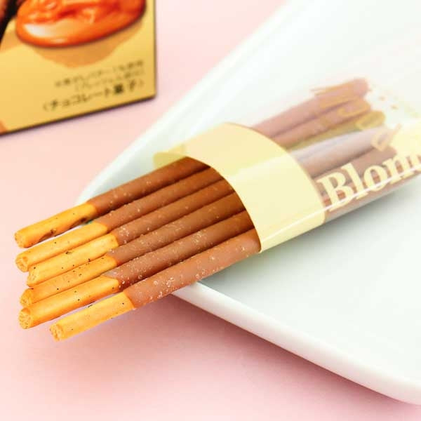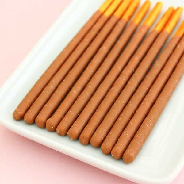 Pocky iscuit sticks covered with sweet caramel chocolate and sprinkled with salt