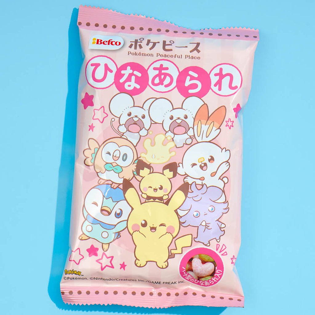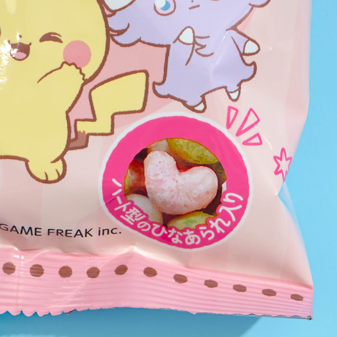Enjoy nibbling on this pack of colorful hina arare rice crackers featuring prints of Pokemon. These pink, green, and white sweet rice crackers are shaped like hearts! Snack on them while playing your favorite video games.