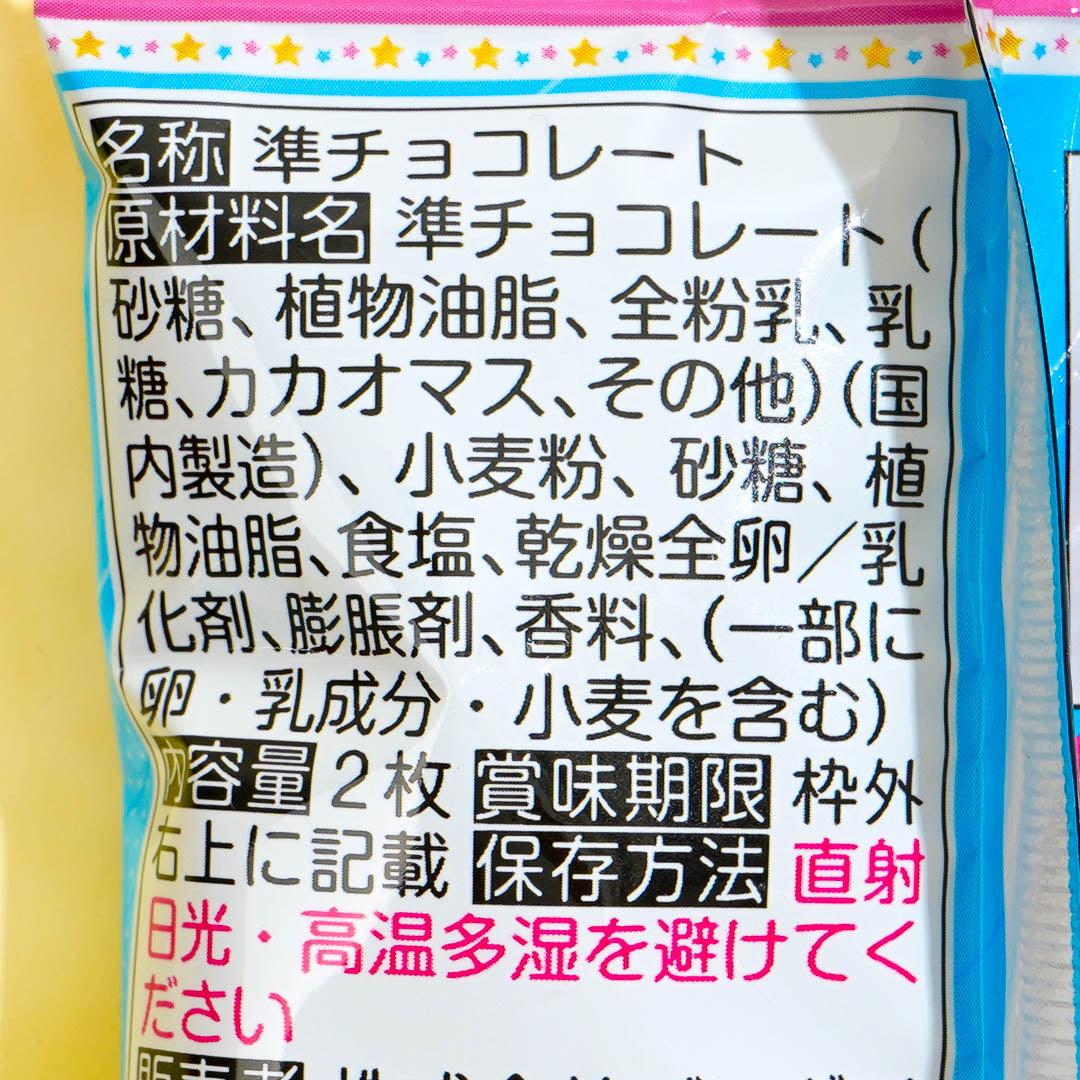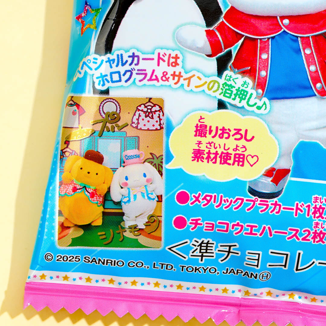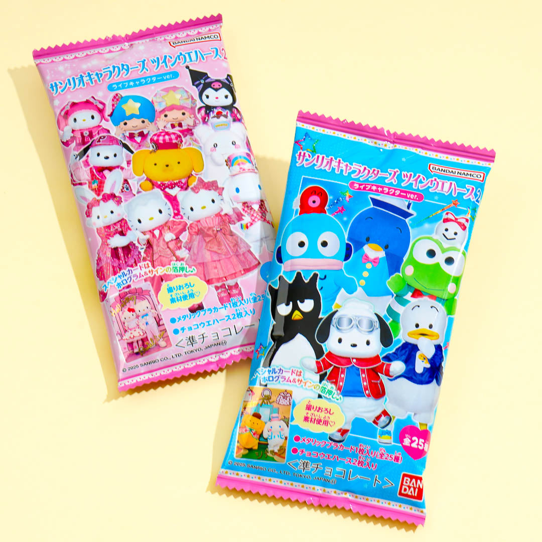 Get ready for double the fun with the second edition of the Sanrio Characters twin wafer set! It comes with two yummy chocolate wafers and a shiny metallic card featuring your favorite live characters in special costumes. Each card has a cute holographic print and a sparkly embossed signature!