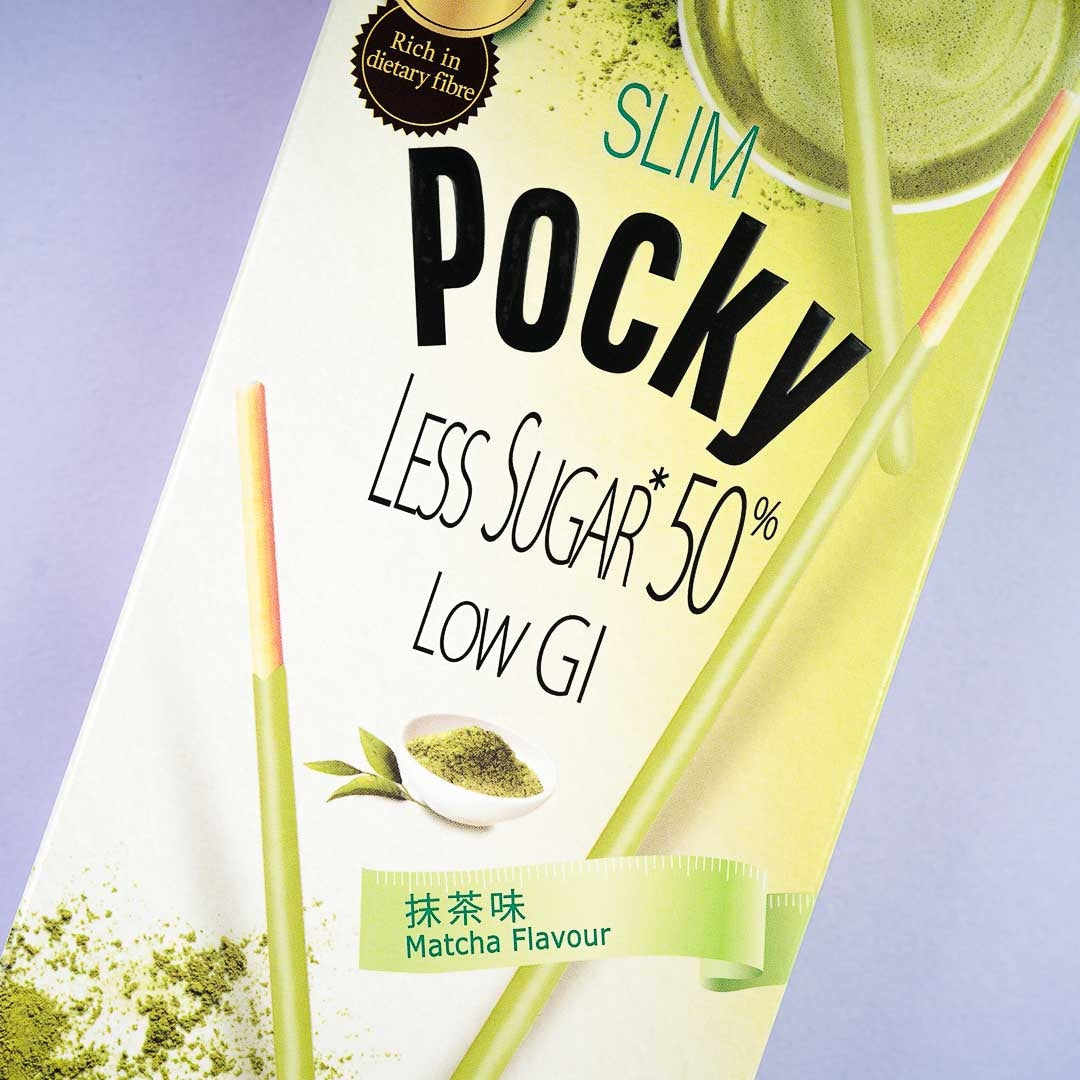 A box of matcha cream-coated biscuit sticks with 50% less sugar, more whole wheat, and added dietary fiber