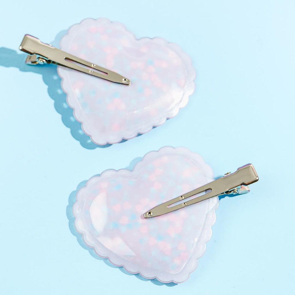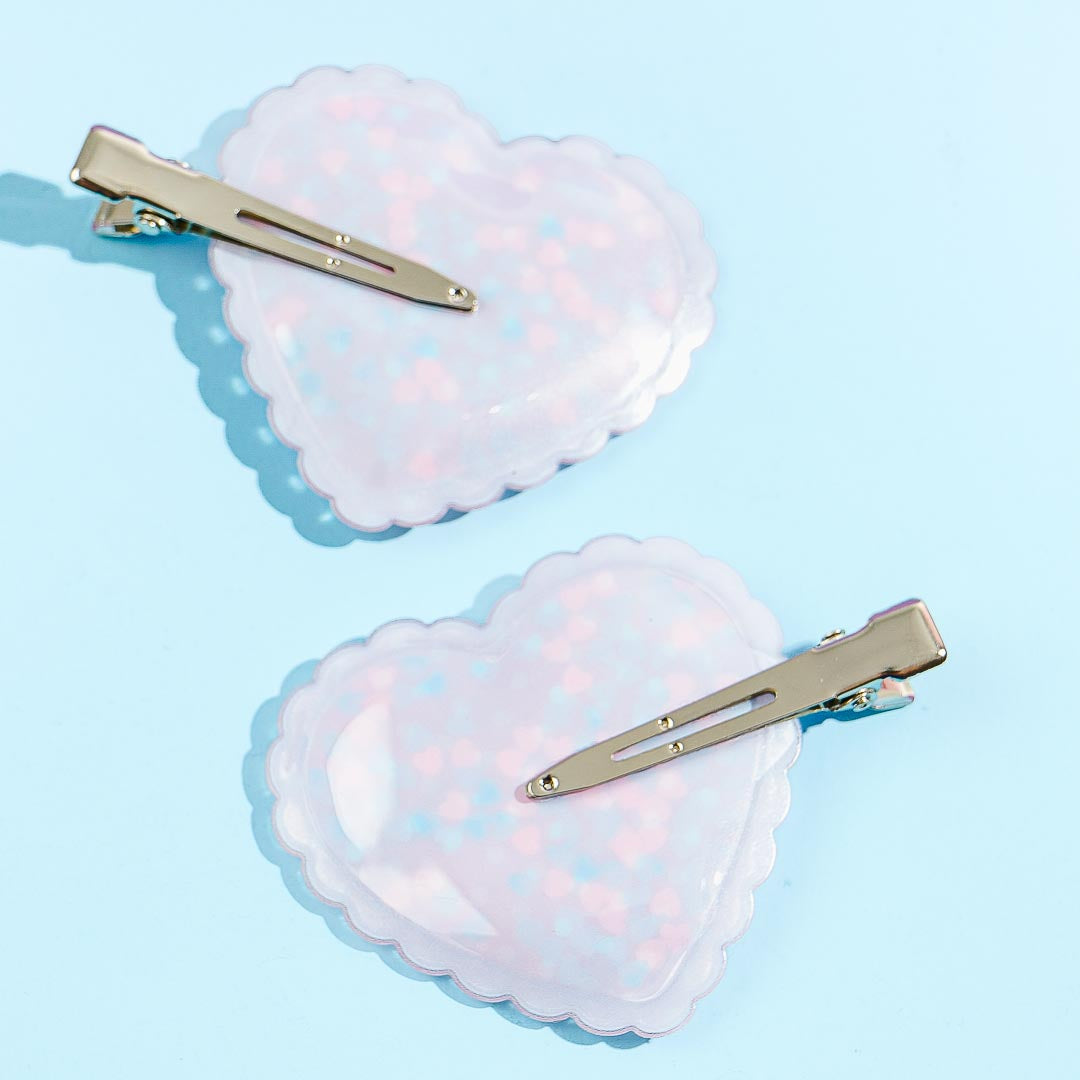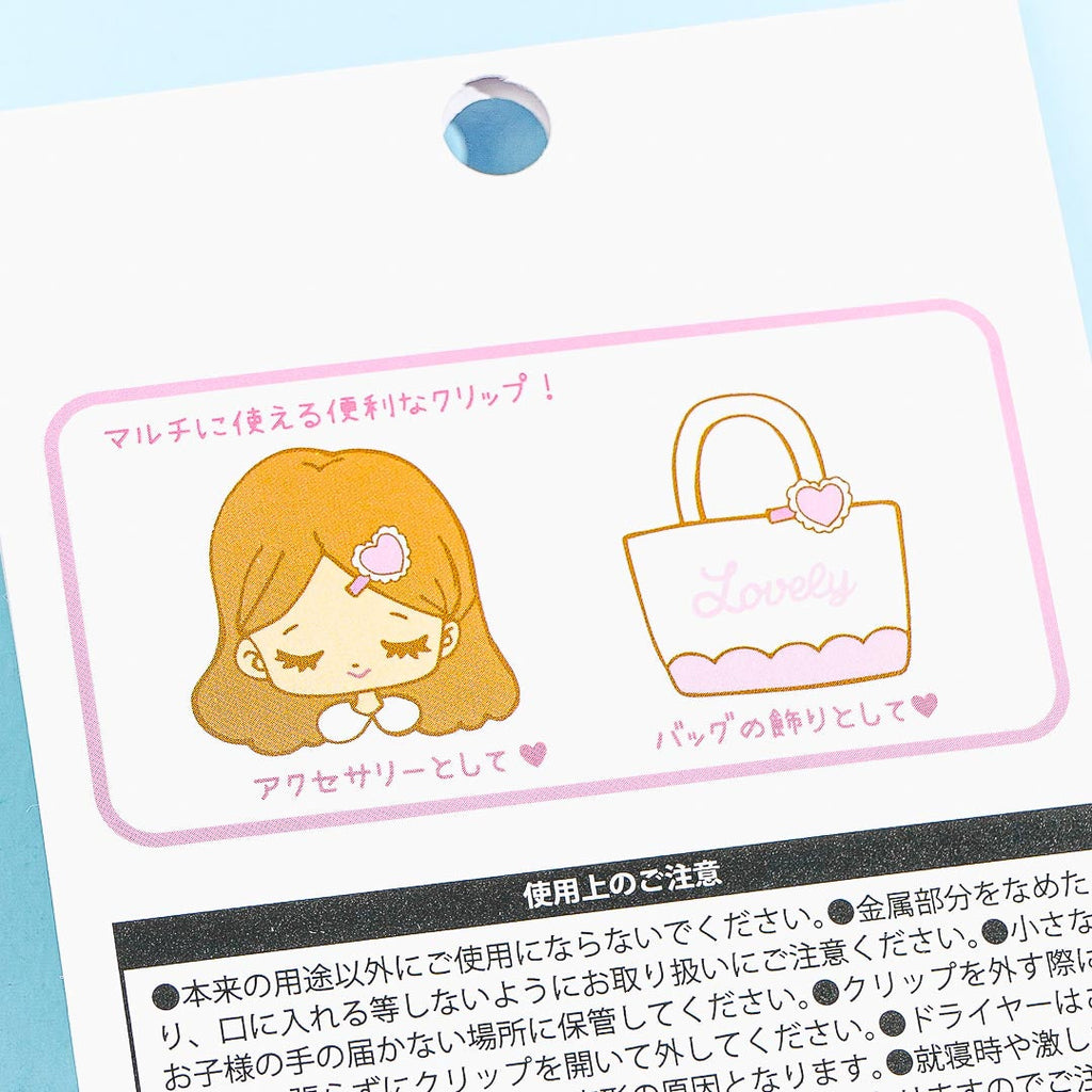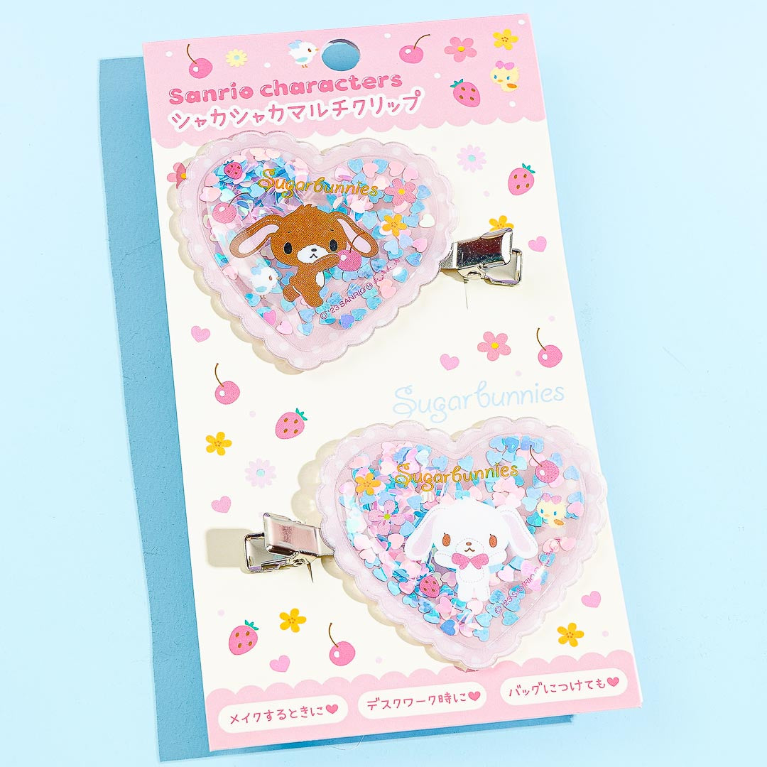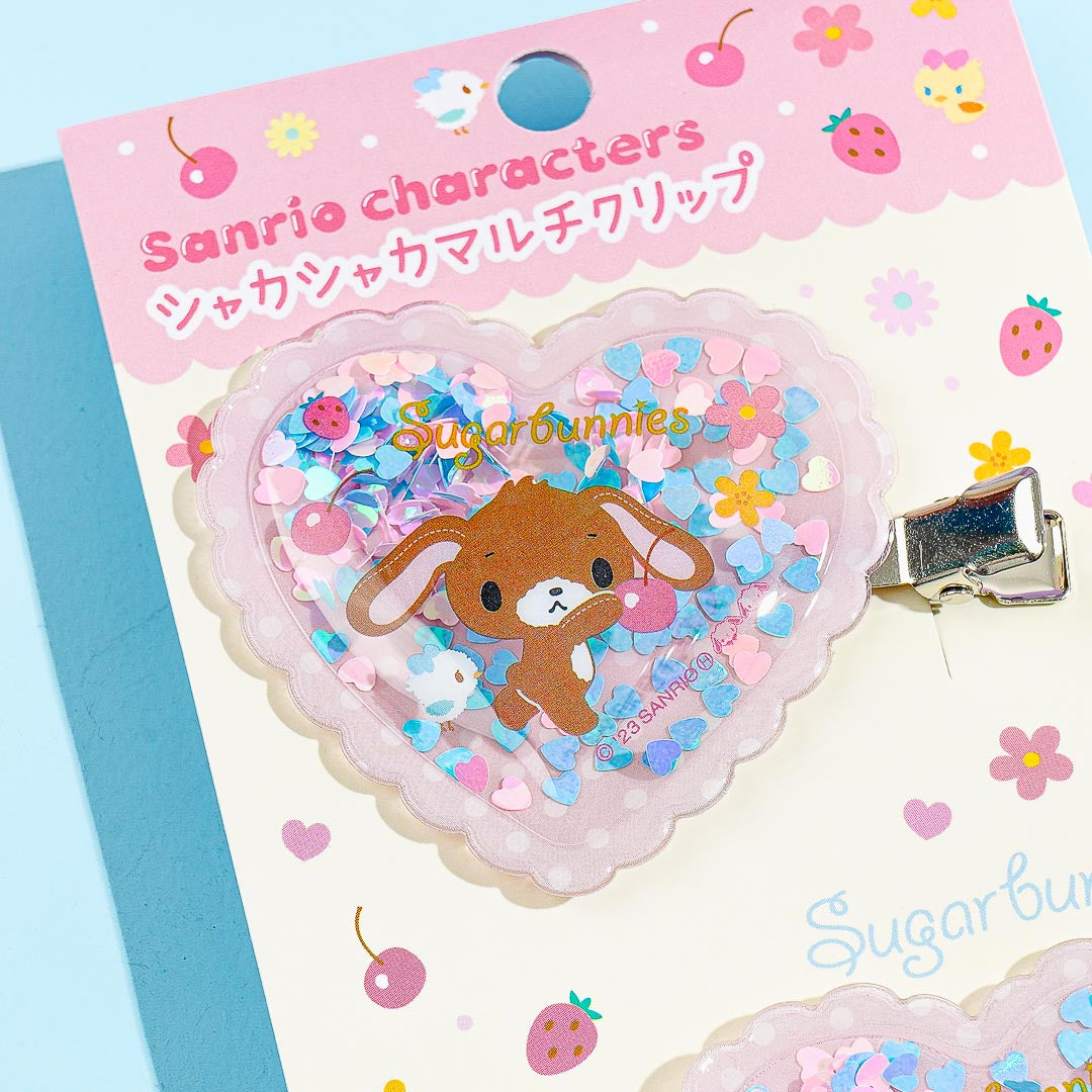 This super cute pair of hair clips is filled with heart-shaped glitter that moves and makes a "shaka-shaka" sound! It also features a cute illustration of Sugarbunnies from Sanrio. Use this to keep your bangs secure while looking kawaii.