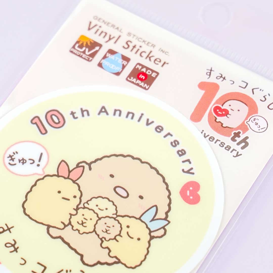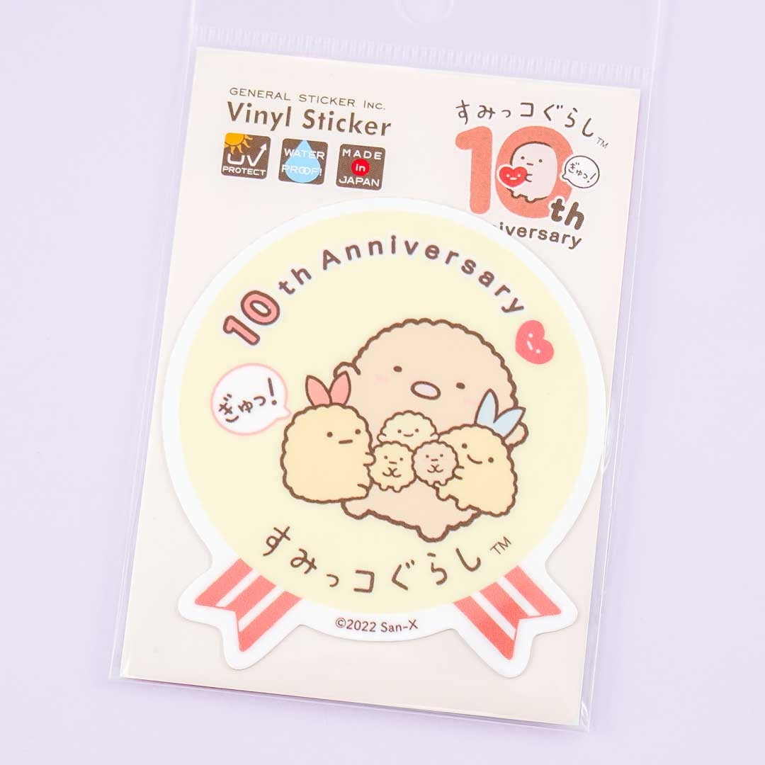 A kawaii vinyl sticker celebrating the 10th Anniversary of the Sumikko Gurashi