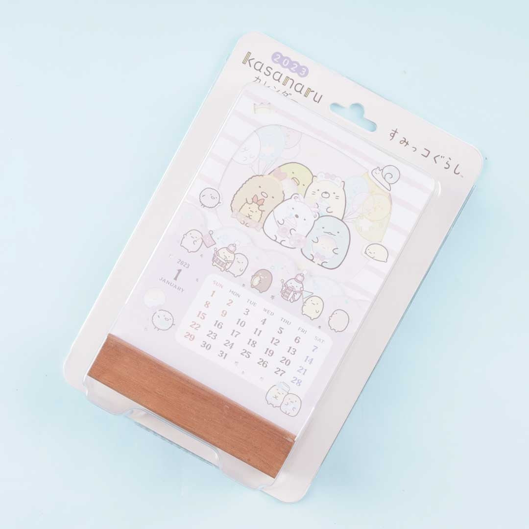 A cute desktop calendar showcasing prints of the Sumikko Gurashi