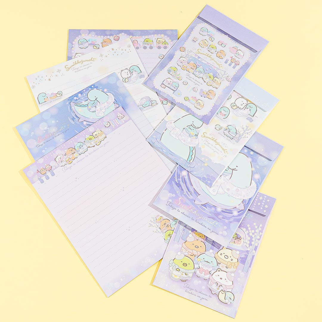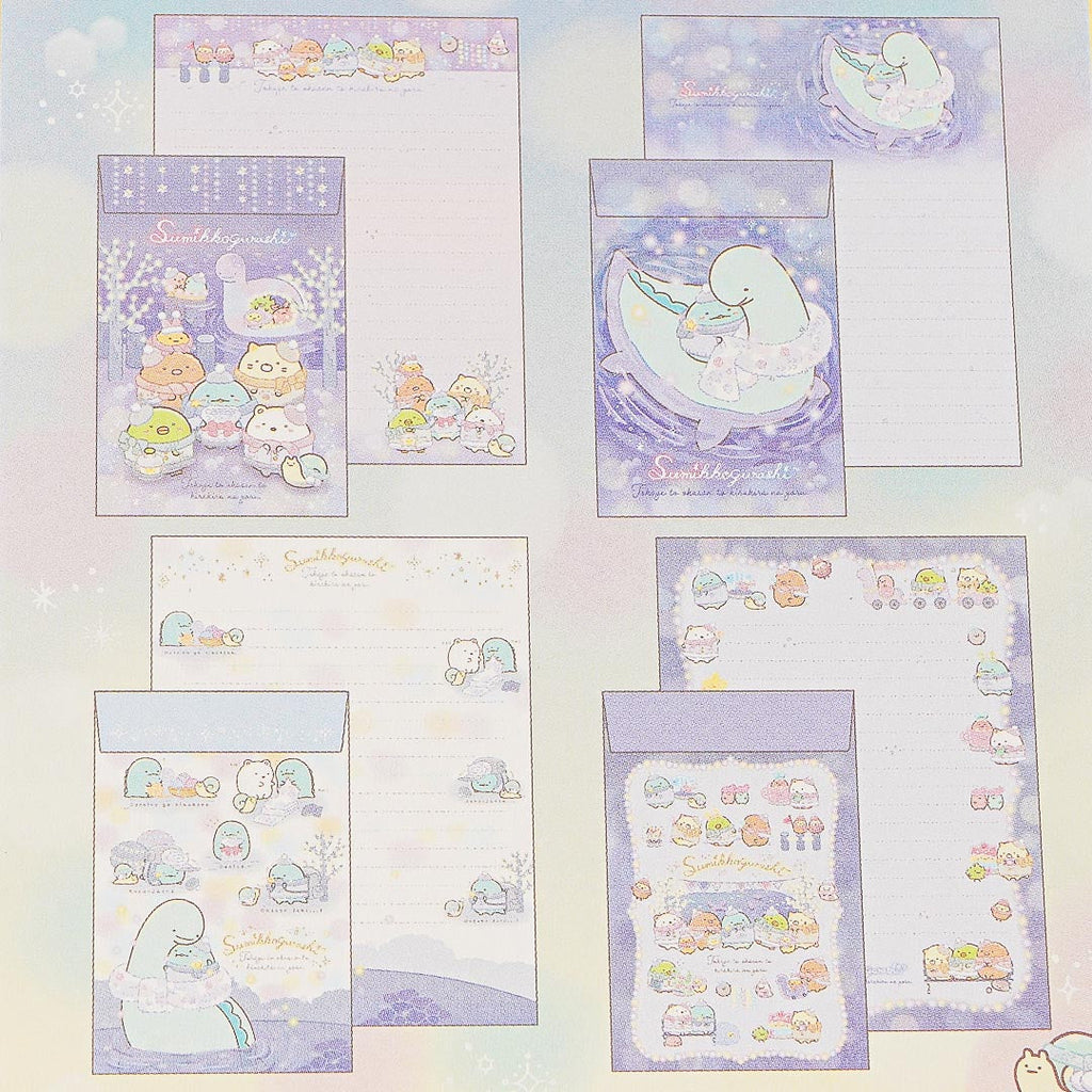 Send handwritten letters to your loved ones using this kawaii letter set! It features prints of Sumikko Gurashi from the "A Sparkling Night With Tokage & Its Mother" series. The lined sheets and matching envelopes have four different designs.