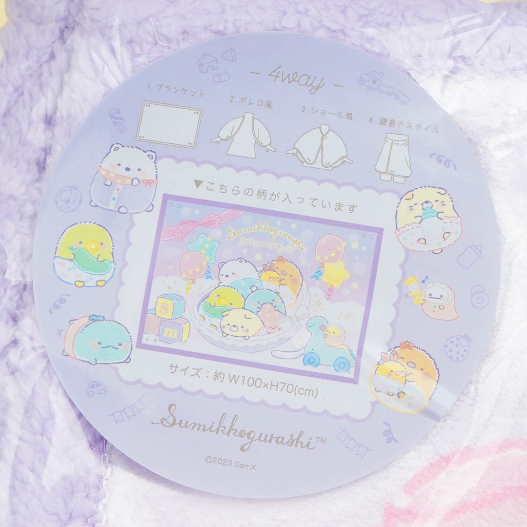 Stay warm and cozy with this cute and fuzzy blanket! It features a kawaii print of Sumikko Gurashi looking like babies. This blanket has snap buttons so you can use it in four different ways — blanket, skirt, shawl, or bolero!