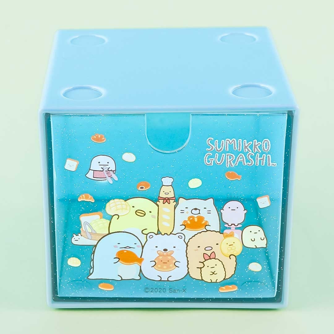 This box-type case has a glittery drawer decorated with the Sumikko Gurashi gang all holding freshly-baked bread! The kawaii chest is made of durable material and can be stacked with drawers of the same size. Use this super cute desktop drawer to organize your makeup products!