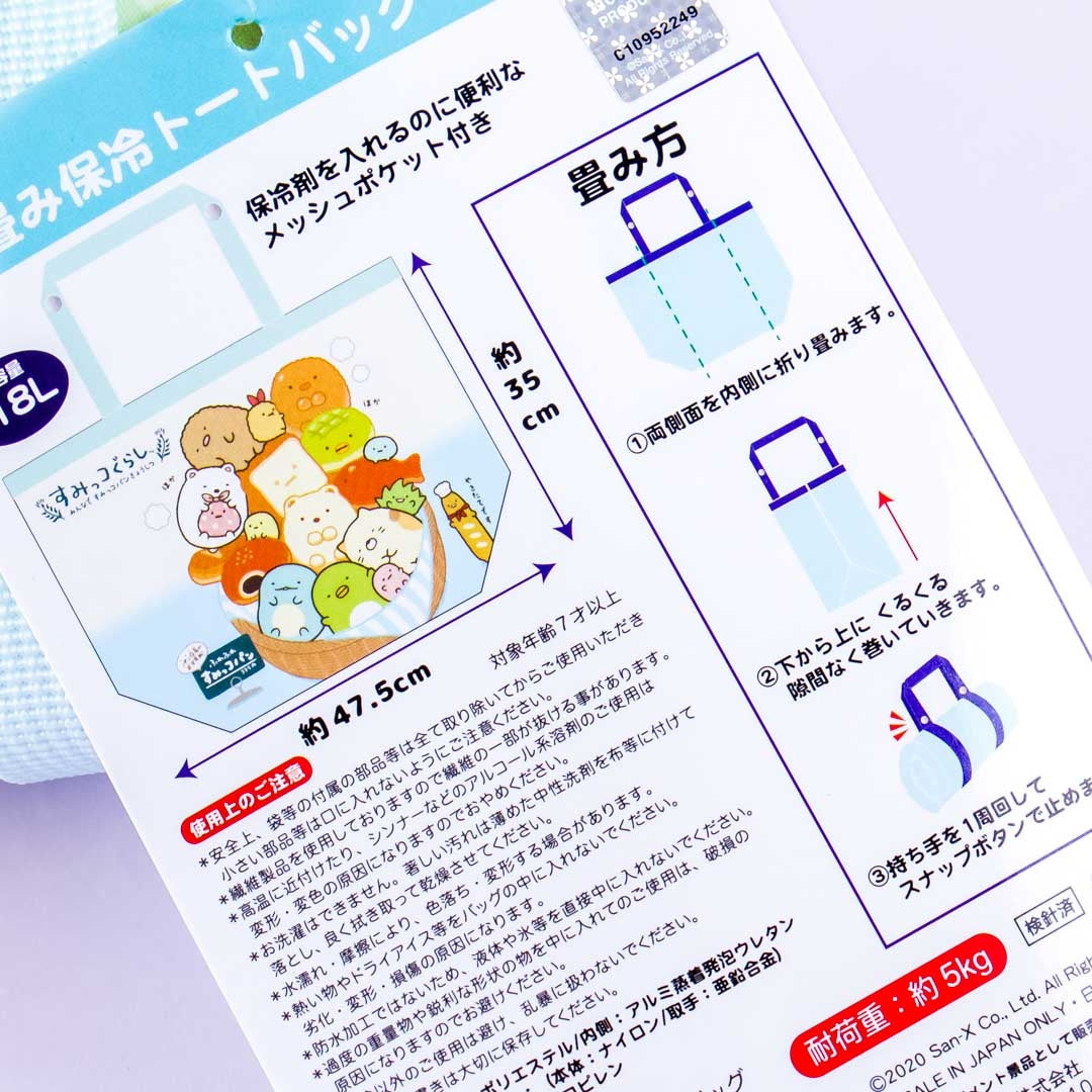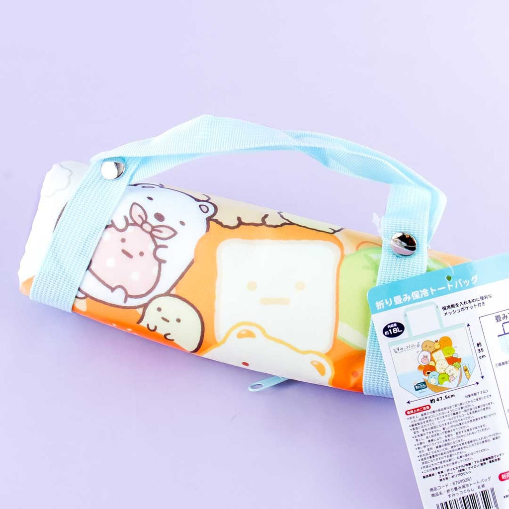 A kawaii foldable insulated shoulder bag illustrated with Sumikko Gurashi characters in a bread basket
