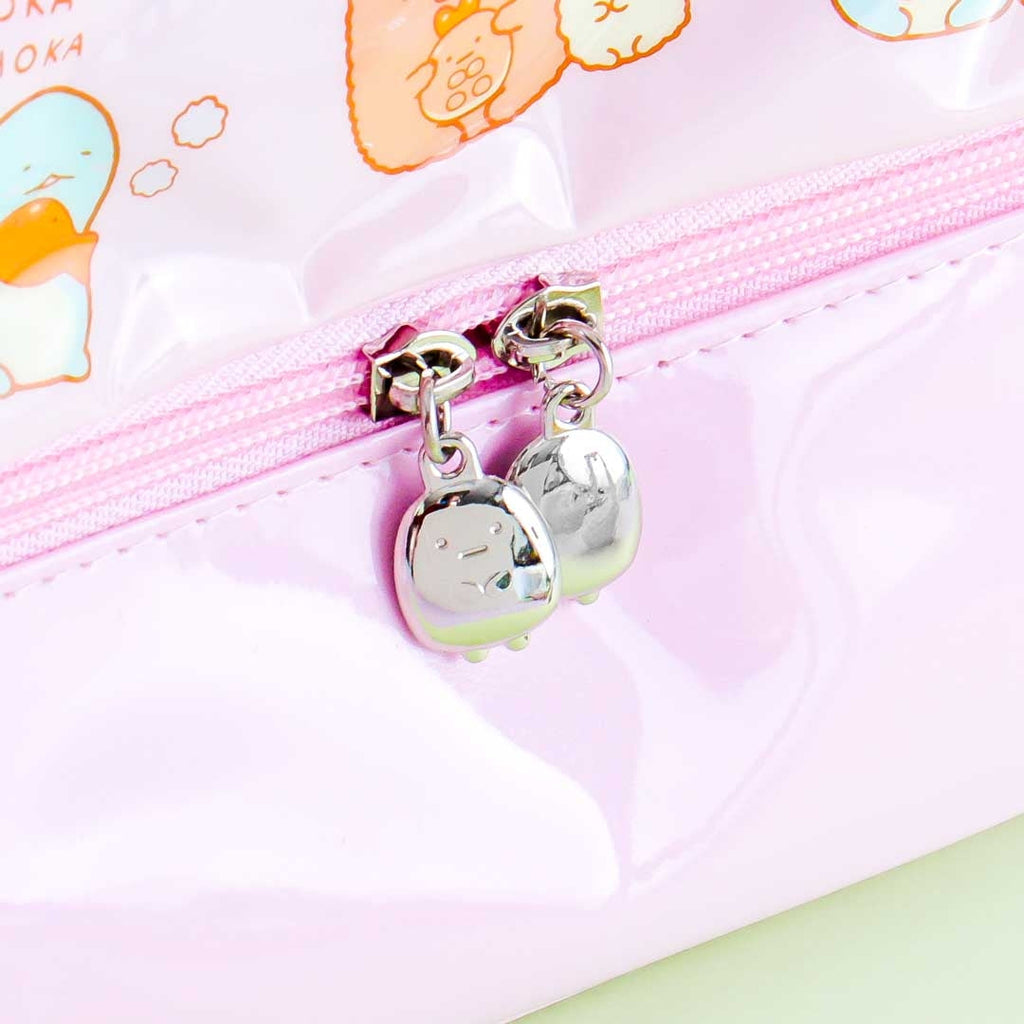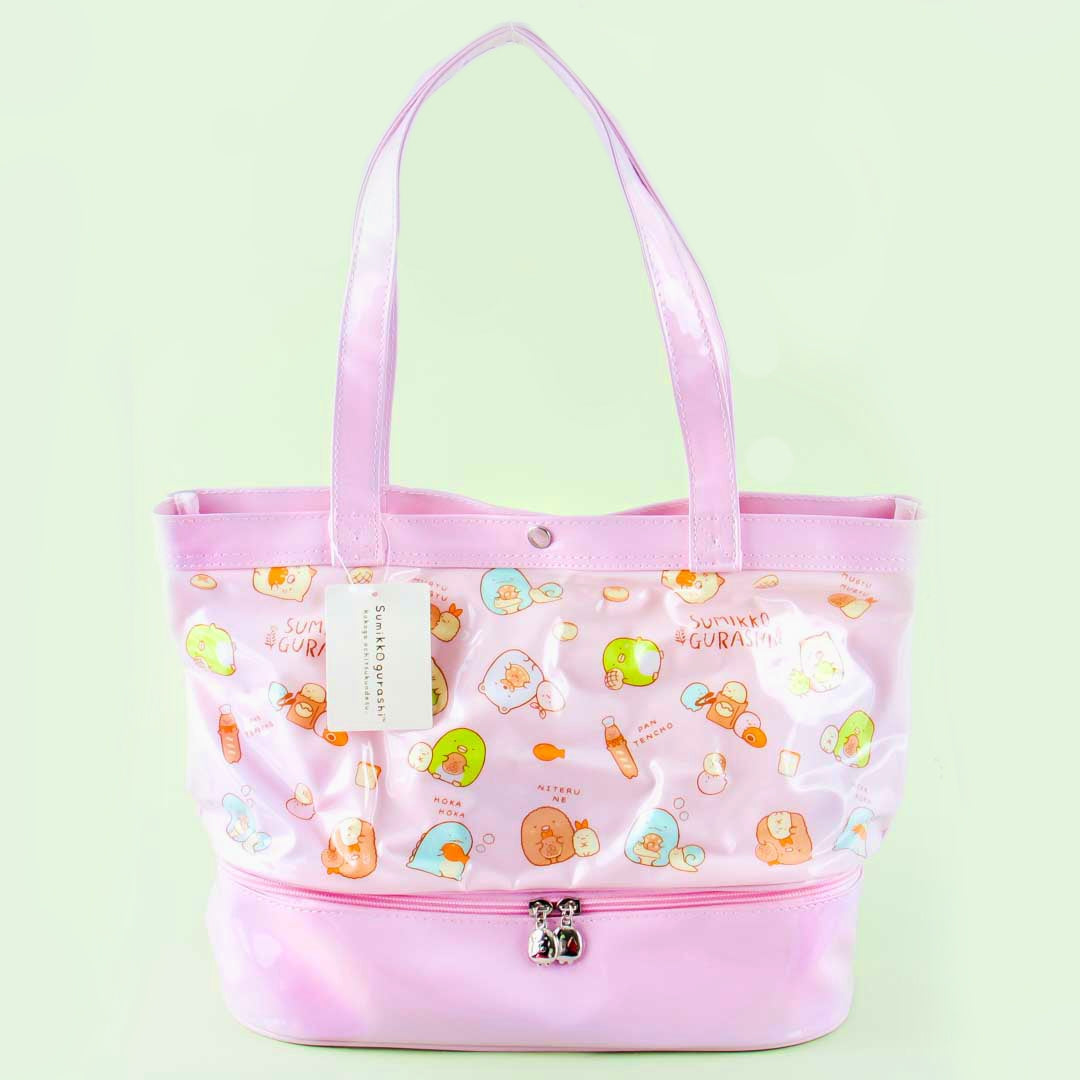 Take this spacious shoulder bag on your next trip! It features illustrations of the Sumikko Gurashi gang with bread. This shoulder bag has a button closure at the top and a zippered bottom section that can fit your slippers.