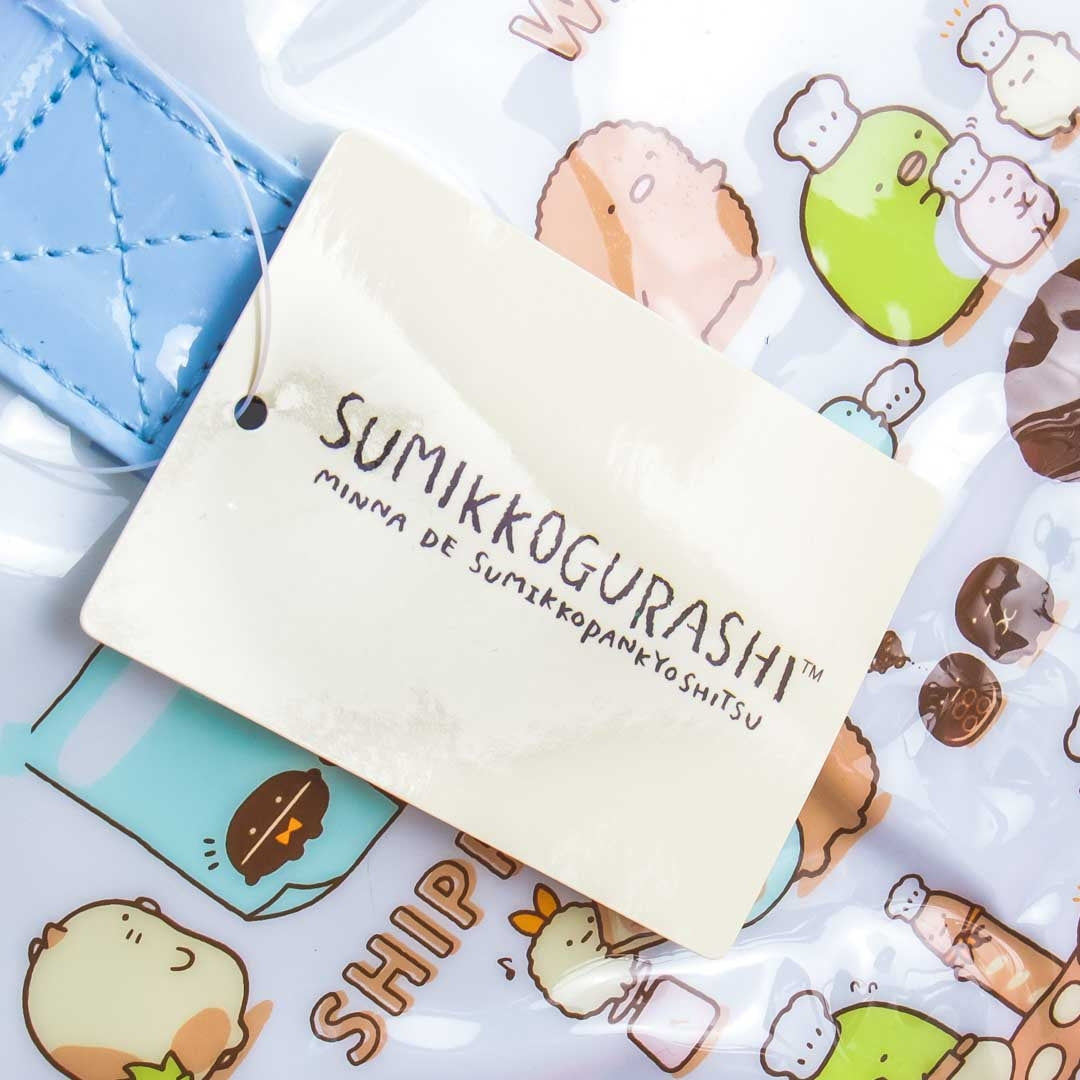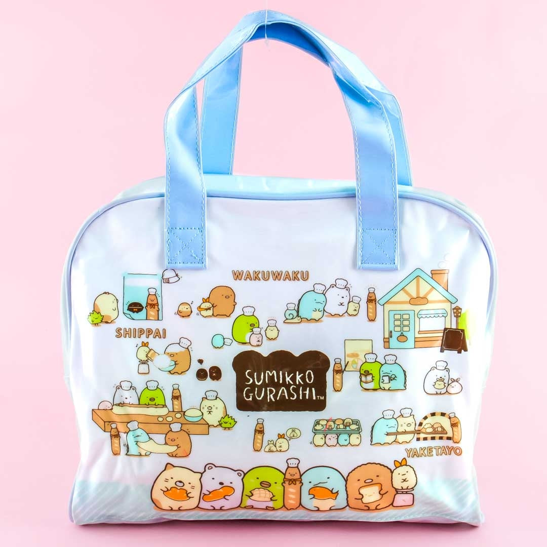 A kawaii zippered handbag featuring the Sumikko Gurashi gang in a baking class