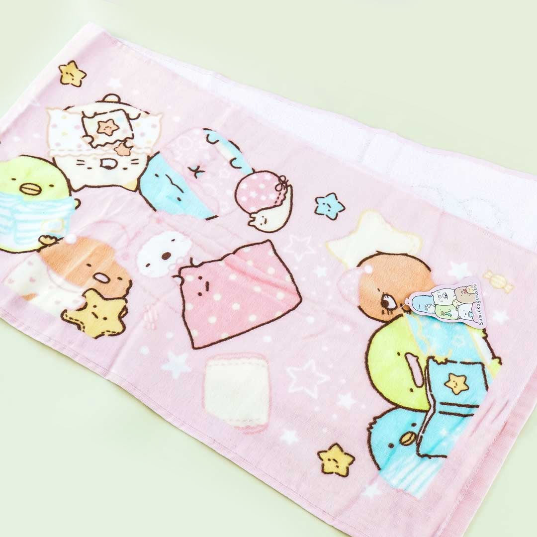 Wipe yourself dry after a long hot shower before bedtime with this super cute long towel. This cotton towel features prints of the Sumikko Gurashi gang ready for bed in their jammies!