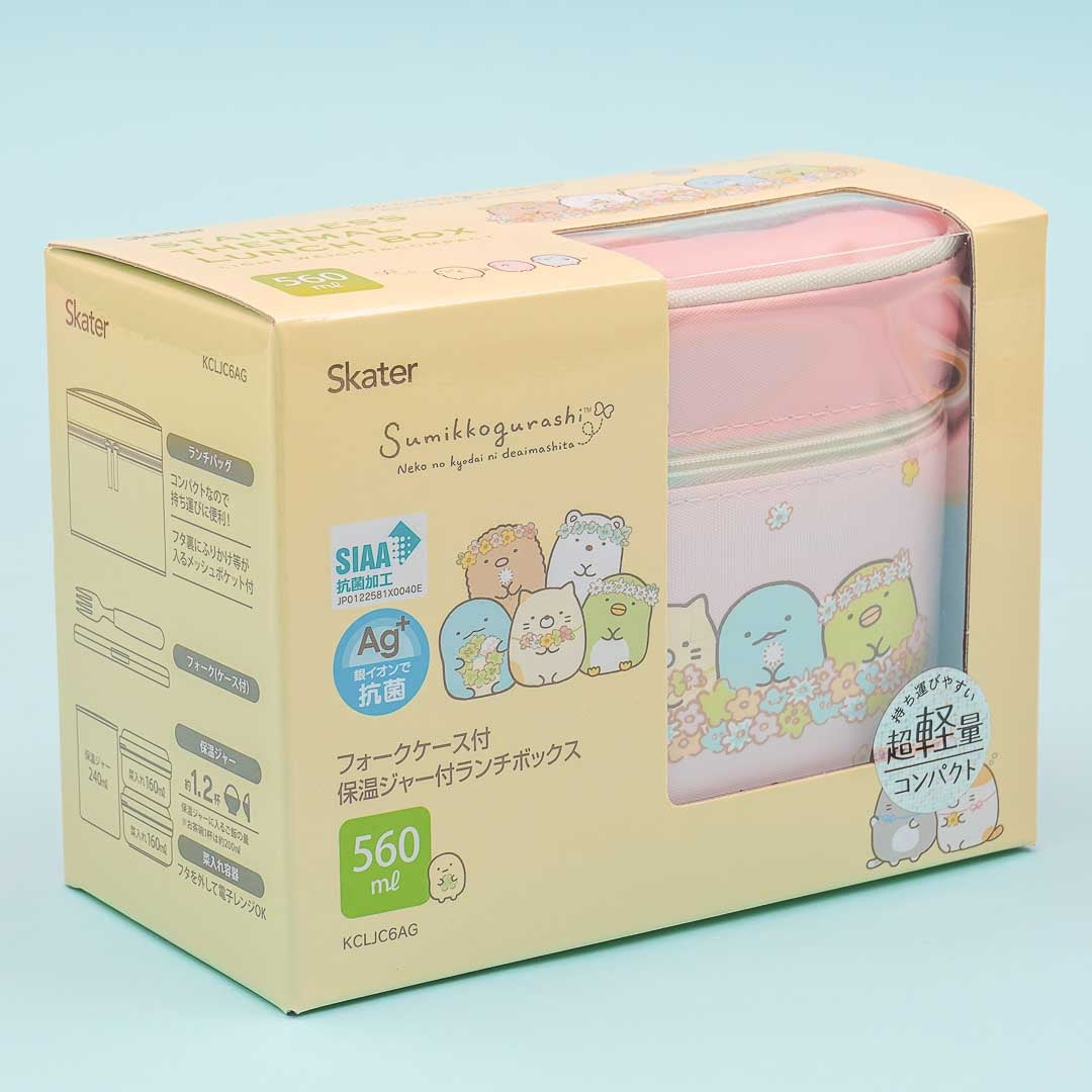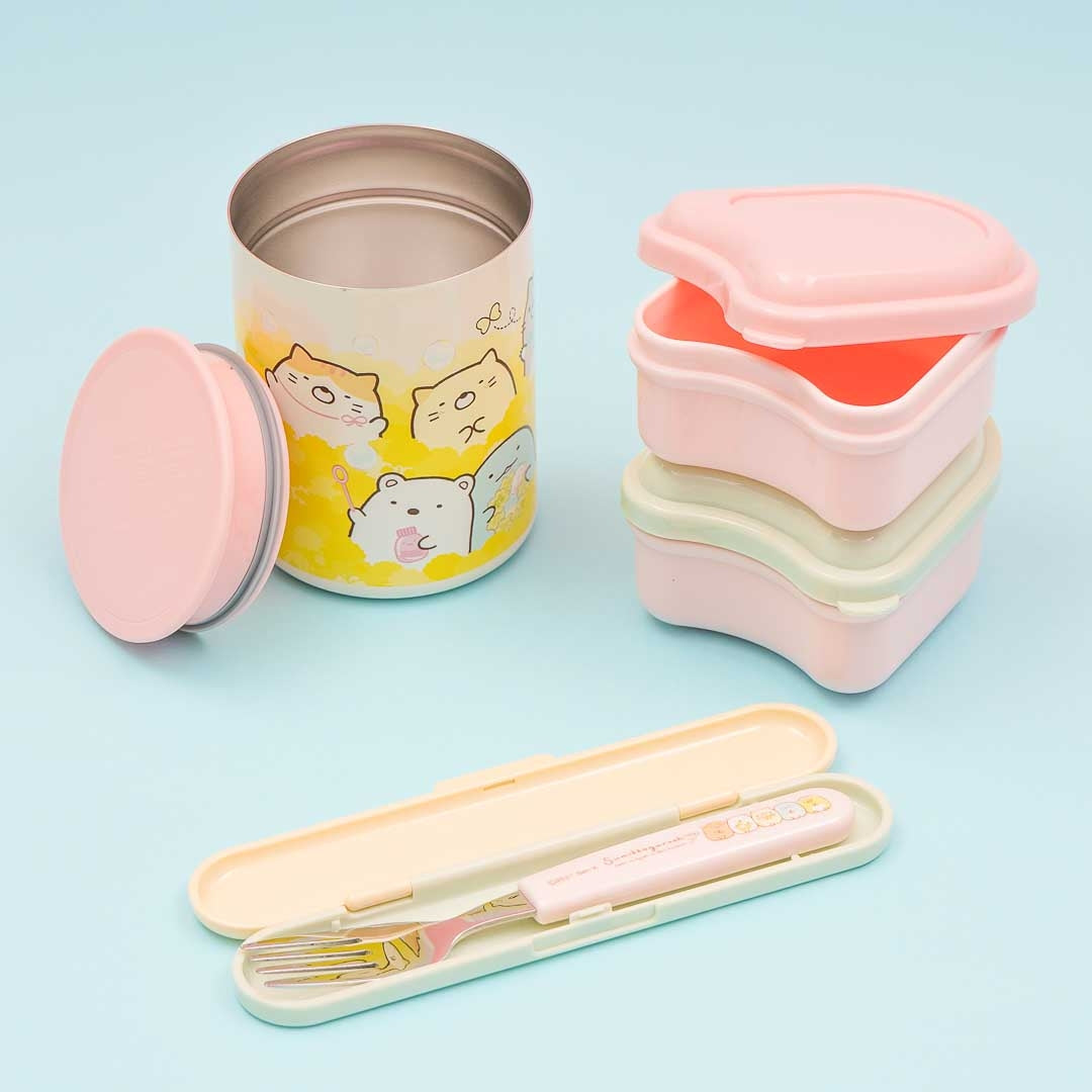 This kawaii bento box set illustrated with the Sumikko Gurashi is perfect for bringing appetizers for lunch. It includes an insulated jar, two vegetable containers, and a fork with a carrying case. You can bring it along easily thanks to its lunch bag. Make sure you remove the lid of the vegetable containers before heating them in the microwave.