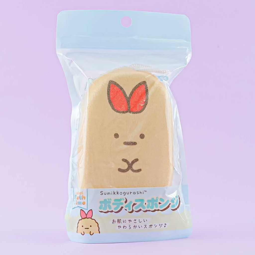 A cute Sumikko Gurashi body sponge with an illustration of Ebifurai