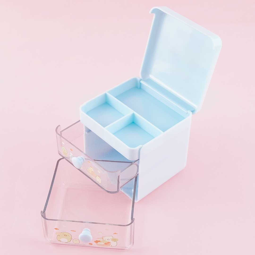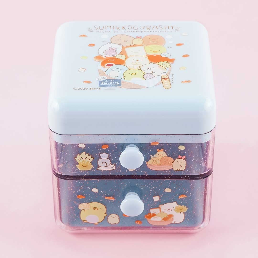 This super cute storage box has kawaii prints of the Sumikko Gurashi gang with their favorite pastries like melon pan, taiyaki, red-bean buns, baguettes, and more! It has two clear pull-out drawers with glitters and an upper compartment with partitions that are covered with a flip-top lid. Use this durable plastic case to organize your bracelets, rings, and other accessories!