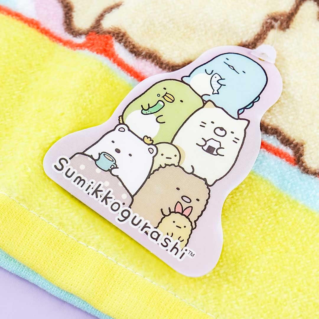 • A super cute long towel illustrated with the Sumikko Gurashi gang as parts of a yummy burger
