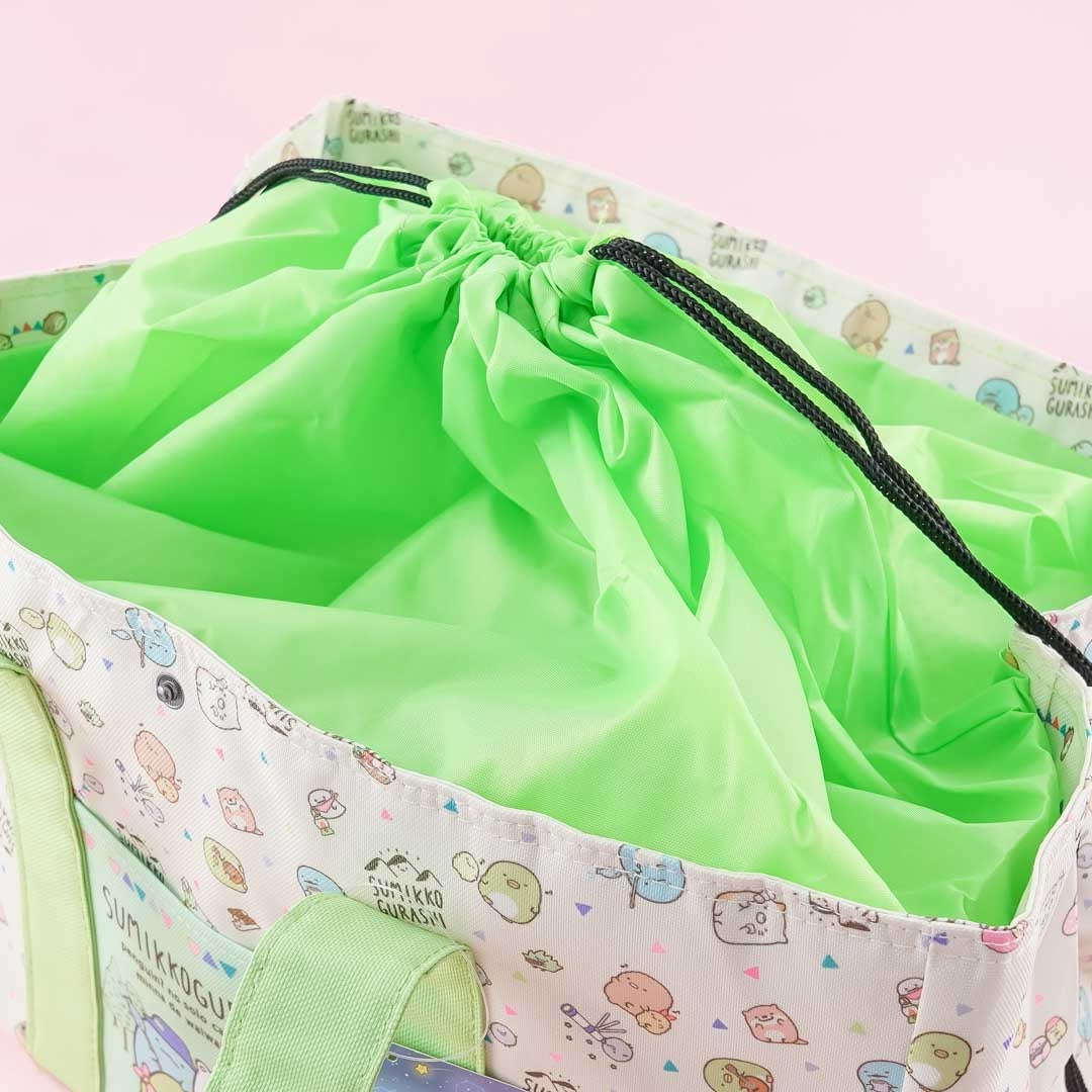 • A cute shopping bag and basket liner with kawaii illustrations of the Sumikko Gurashi gang camping together
